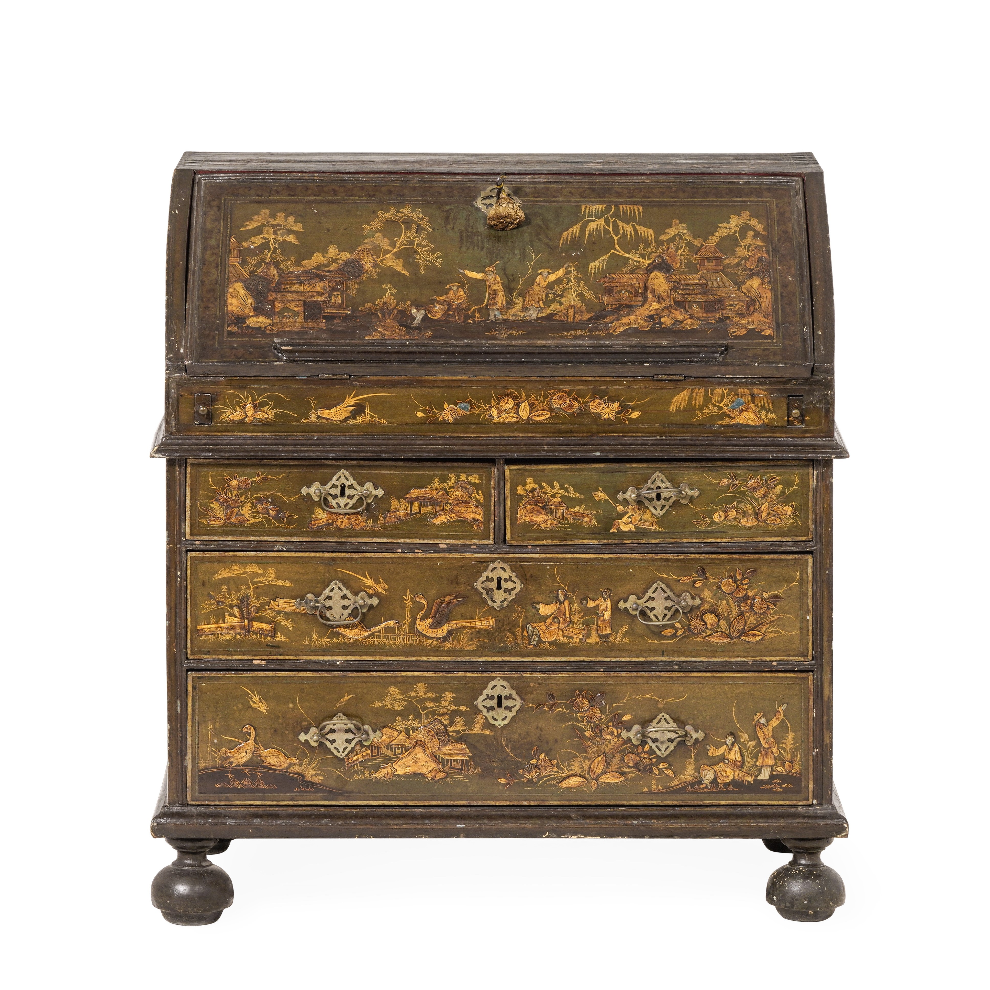 Decori a rilievo e parzialmente dorati su fondo di lacca verde, fronte a due cassetti grandi e due più piccoli in linea, anta ribaltabile celante interno laccato rosso con vani, cassettini e anta a specchio, piedi sferici