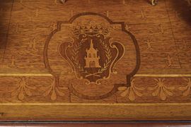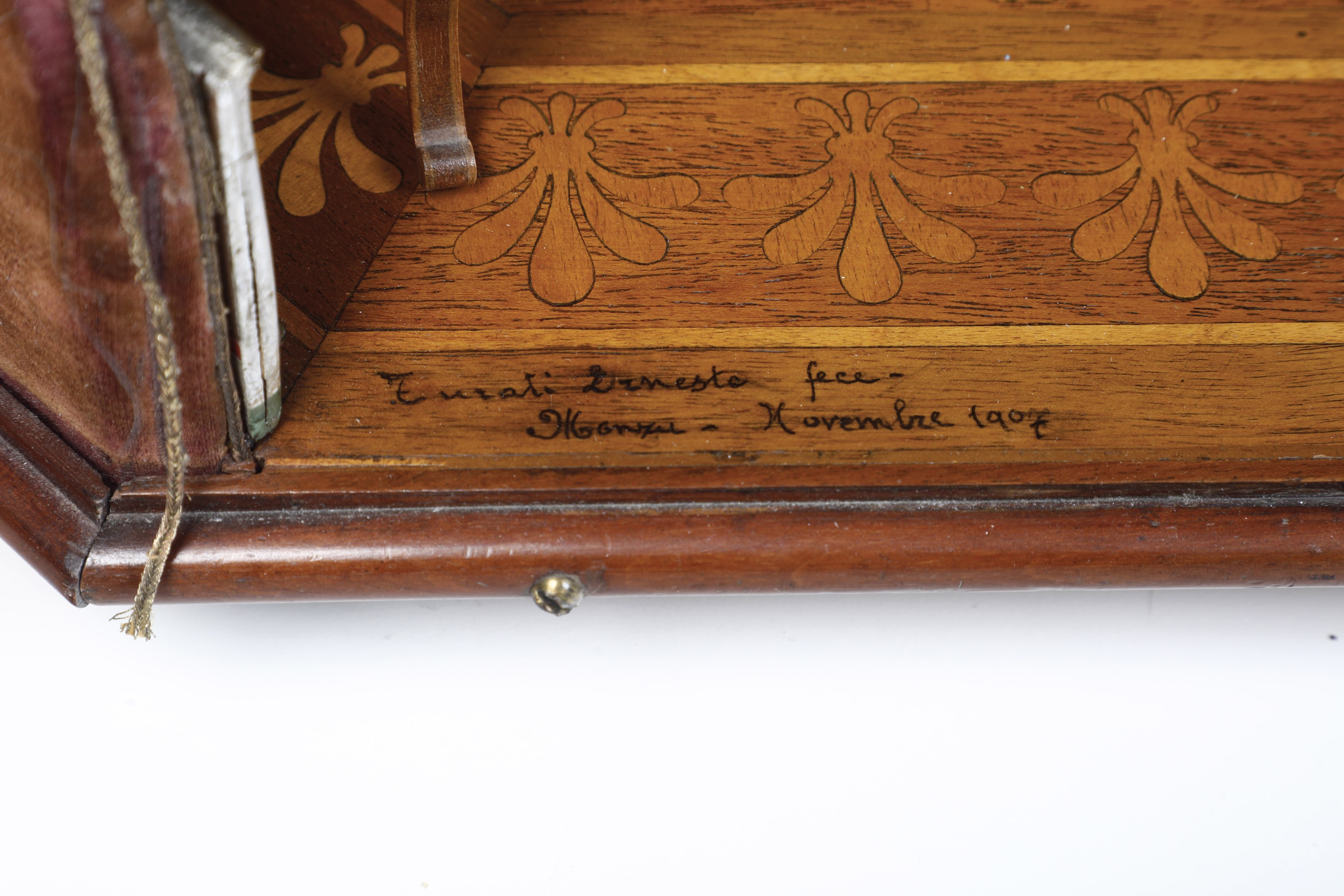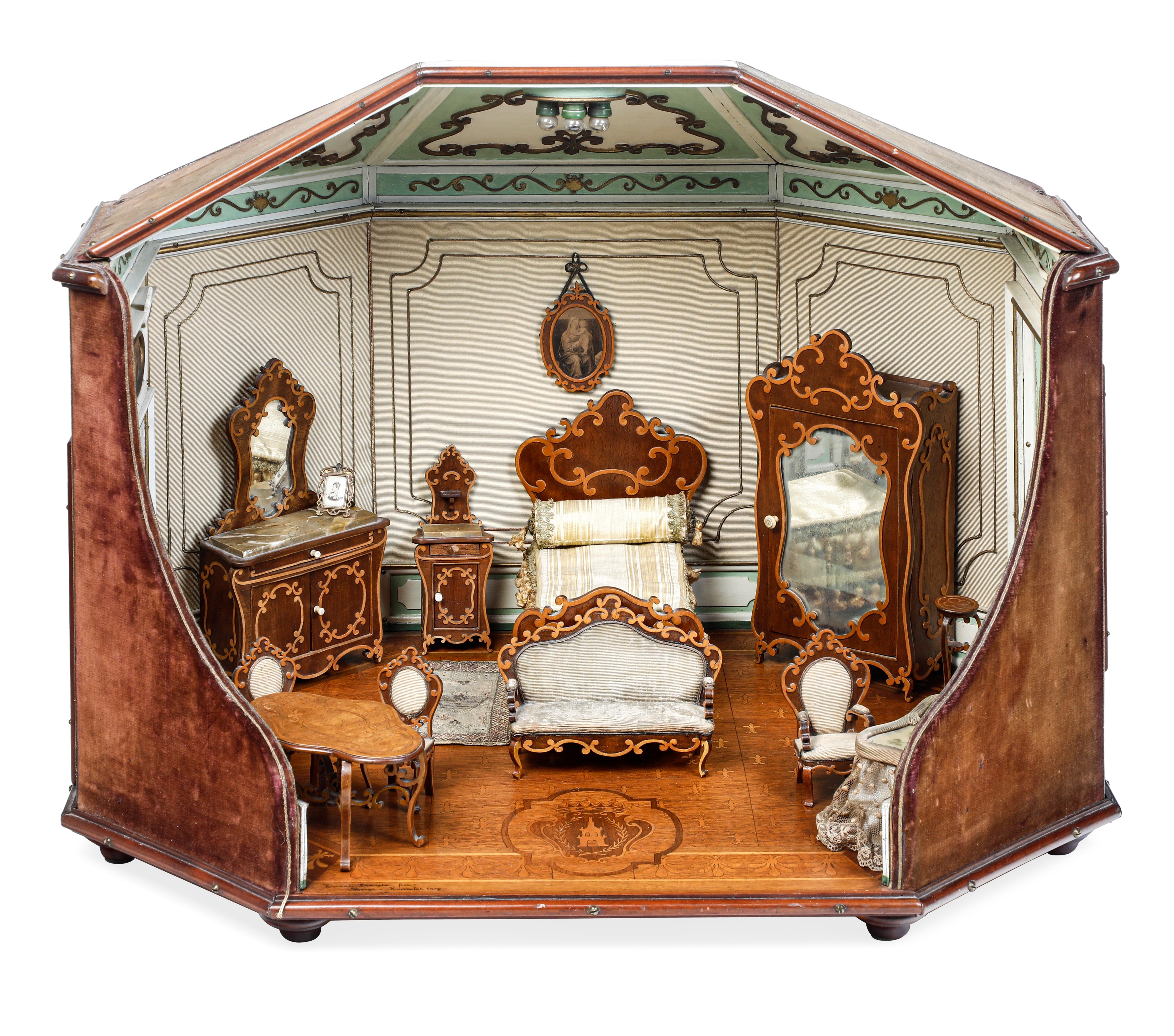 Firmata Turati Ernesto fece, Monza, Novembre 1907. Il mobilio in miniatura in noce con intarsi in acero comprende, tra gli altri, un letto, un armadio, un cassettone con marmo, una toeletta con specchio, una cornice con ritratto della Contessa. Struttura della stanza in pioppo, esternamente rivestito con velluto. Boiserie interna laccata e decorata con filettature in oro, pareti rivestite in seta. Il pavimento intarsiato in mogano e acero reca la firma dell'esecutore