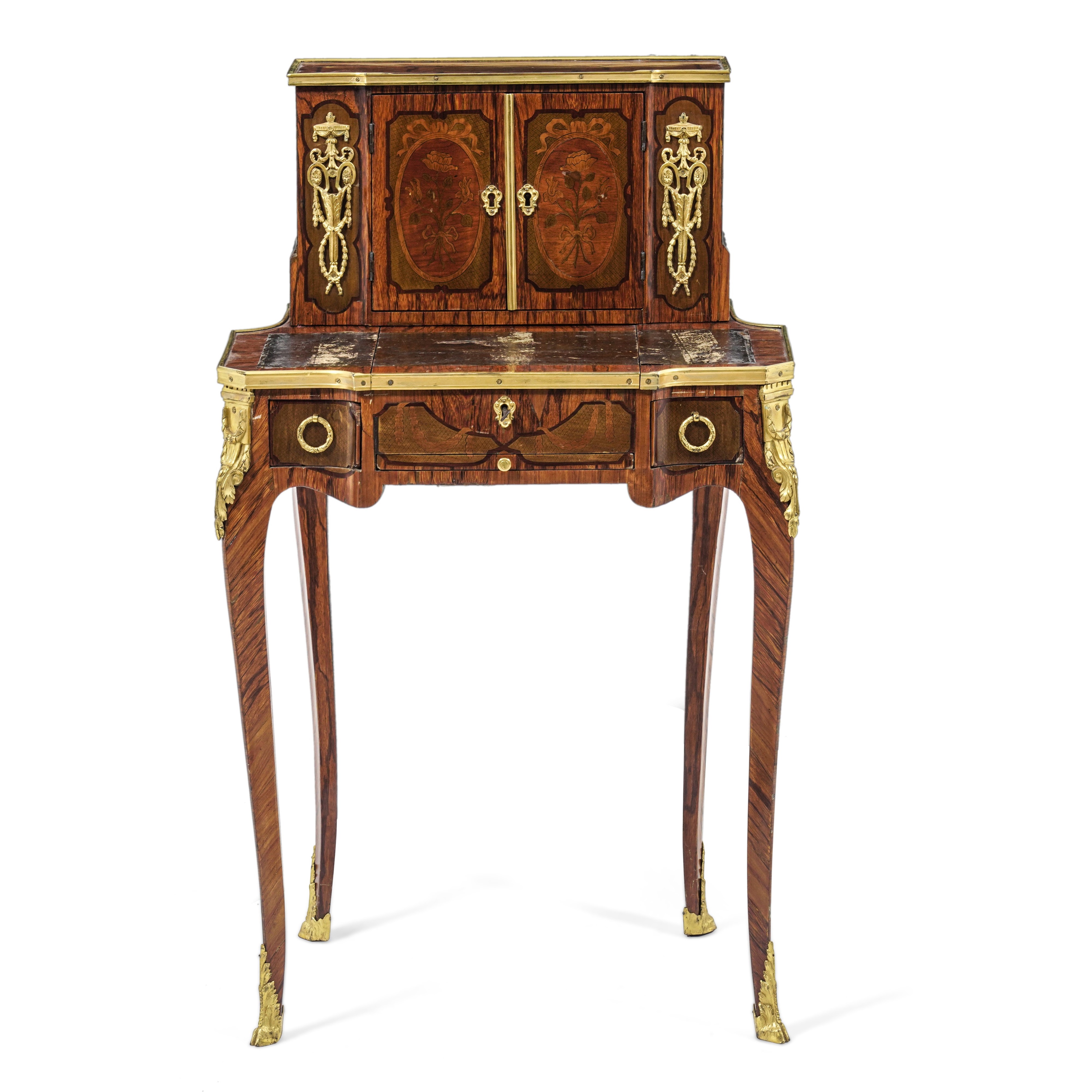 Lastronato in bois de rose e intarsiato. Parte inferiore con tiretto, due cassetti laterali e al centro un finto cassetto, il cui piano estraibile cela uno specchio con cornice in pelle impressa in oro. Alzata a due ante intarsiate a mazzi di fiori entro filettature ovali, all'interno ripiani a giorno. Ghiere, profili, applicazioni e scarpette in bronzo dorato (difetti al piano)