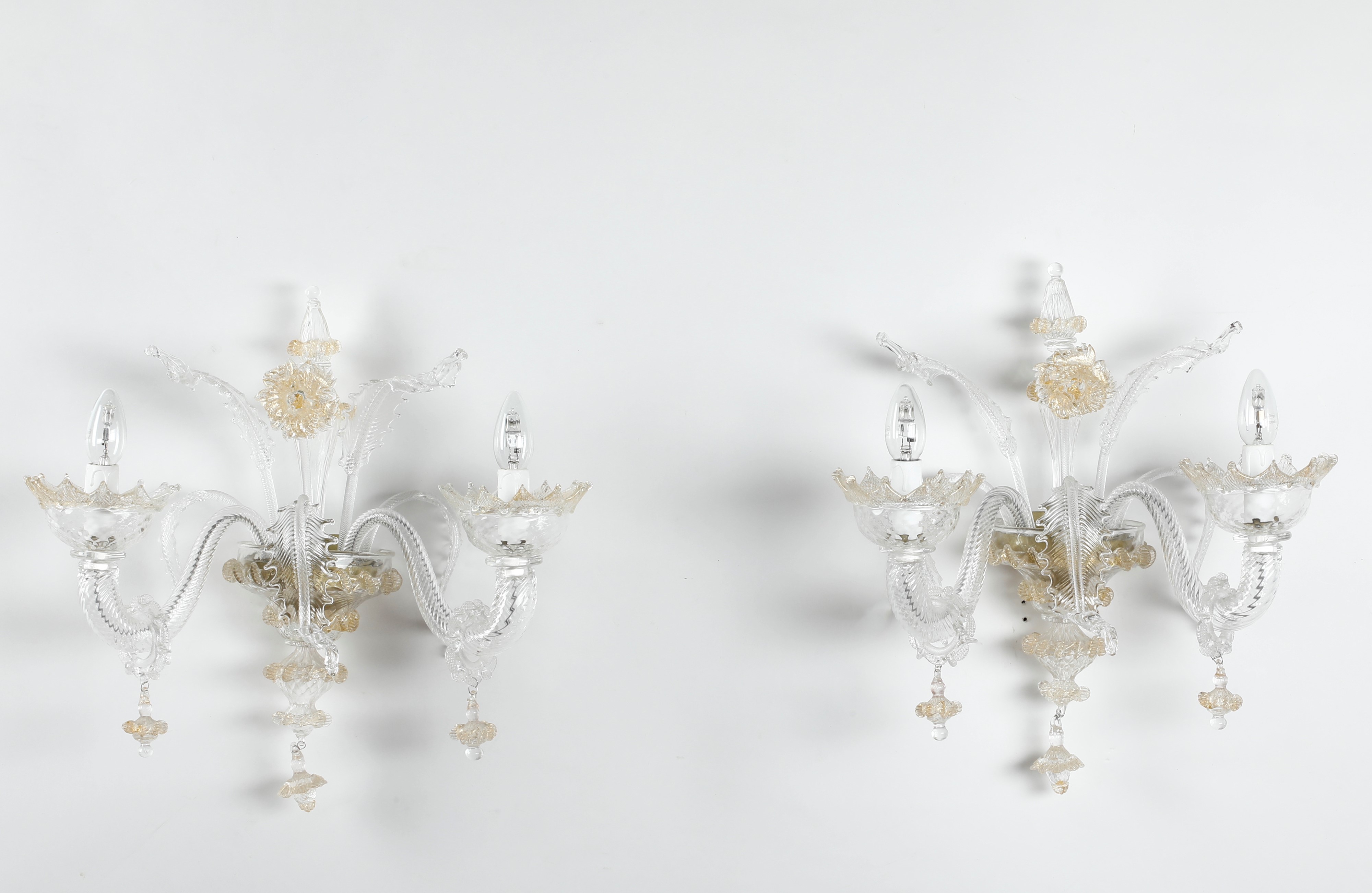 Coppia di appliques in vetro di Murano bianco e oro a due braccia