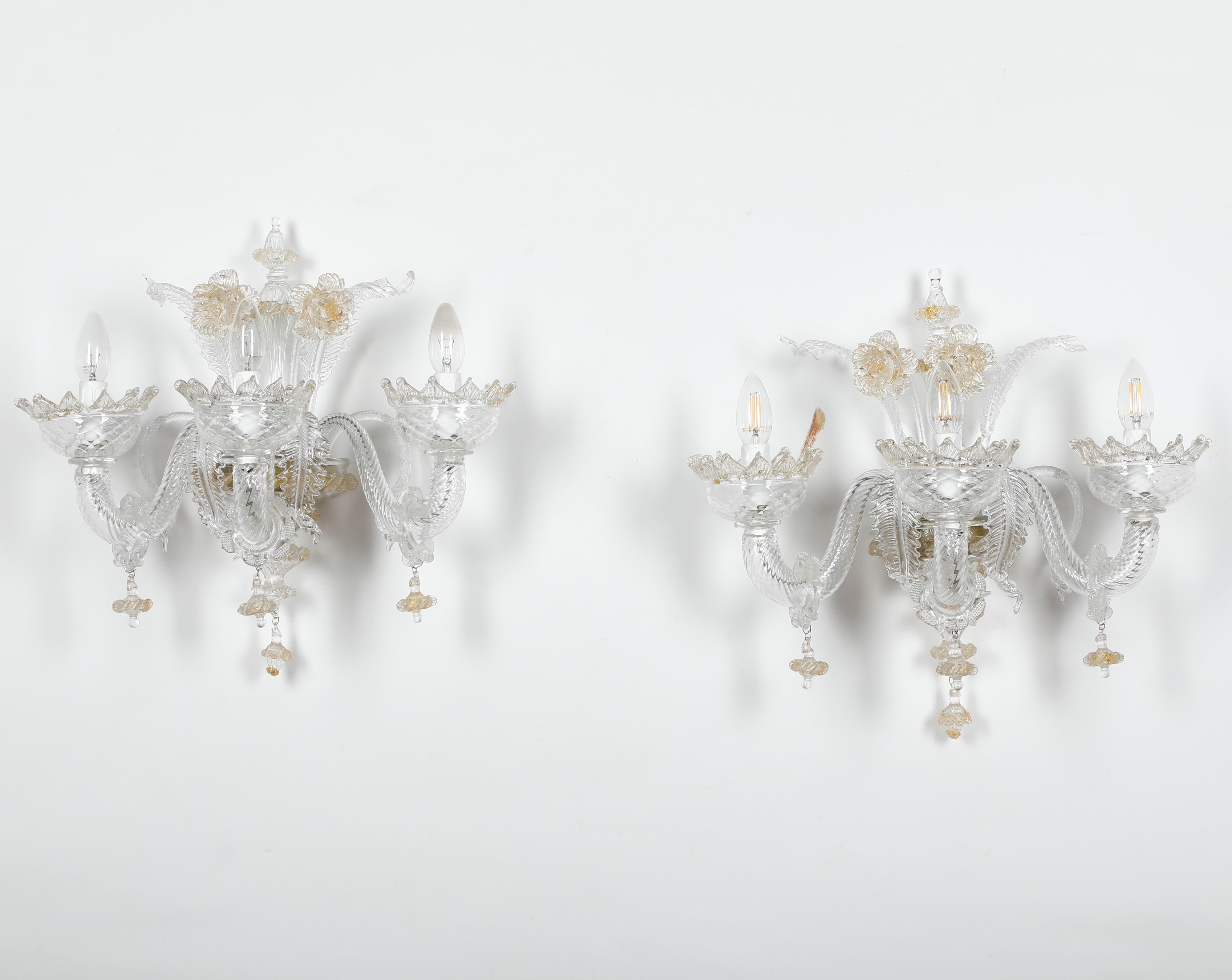Coppia di appliques in vetro di Murano bianco e oro a tre braccia