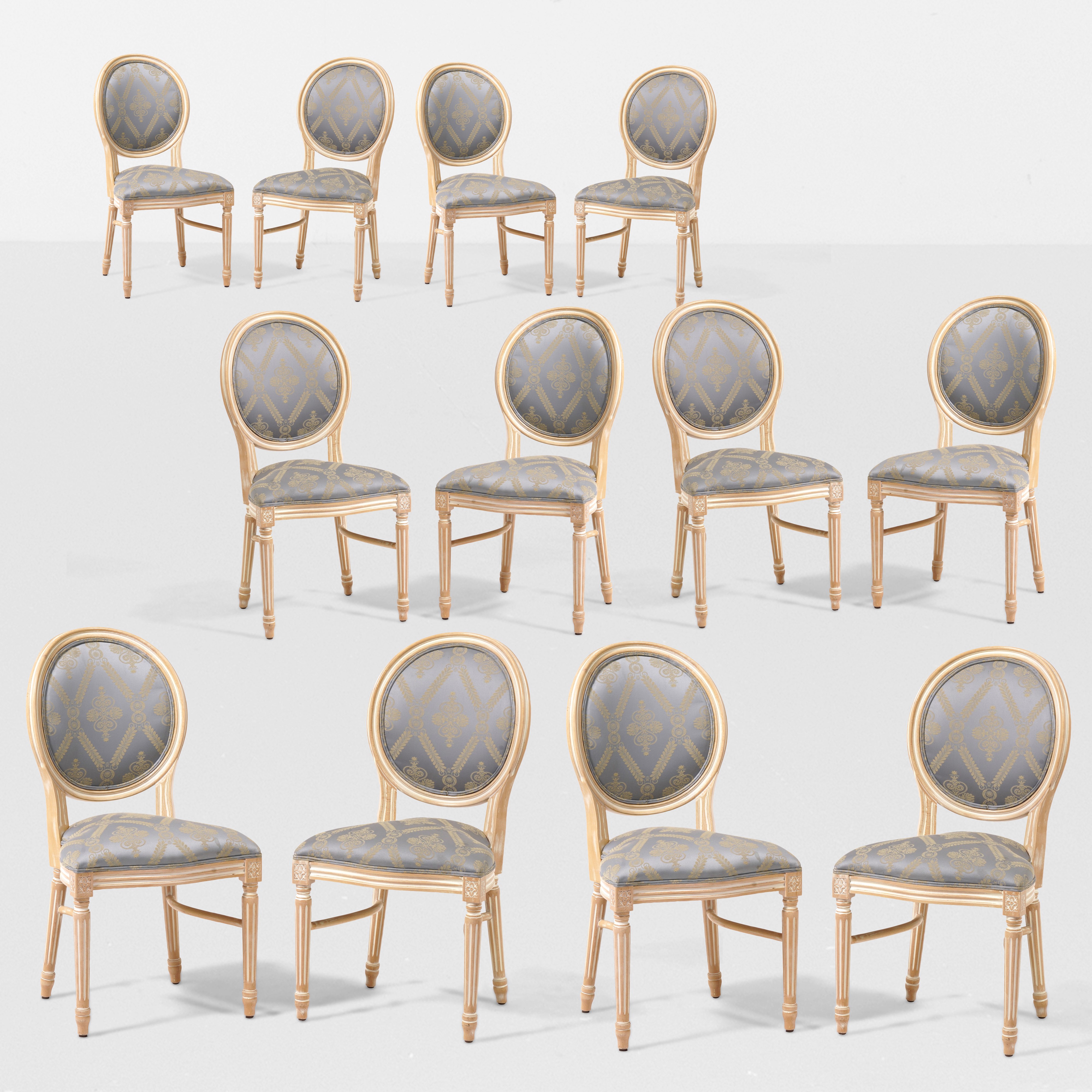 Dodici sedie in legno intagliato e dipinto. XX secolo