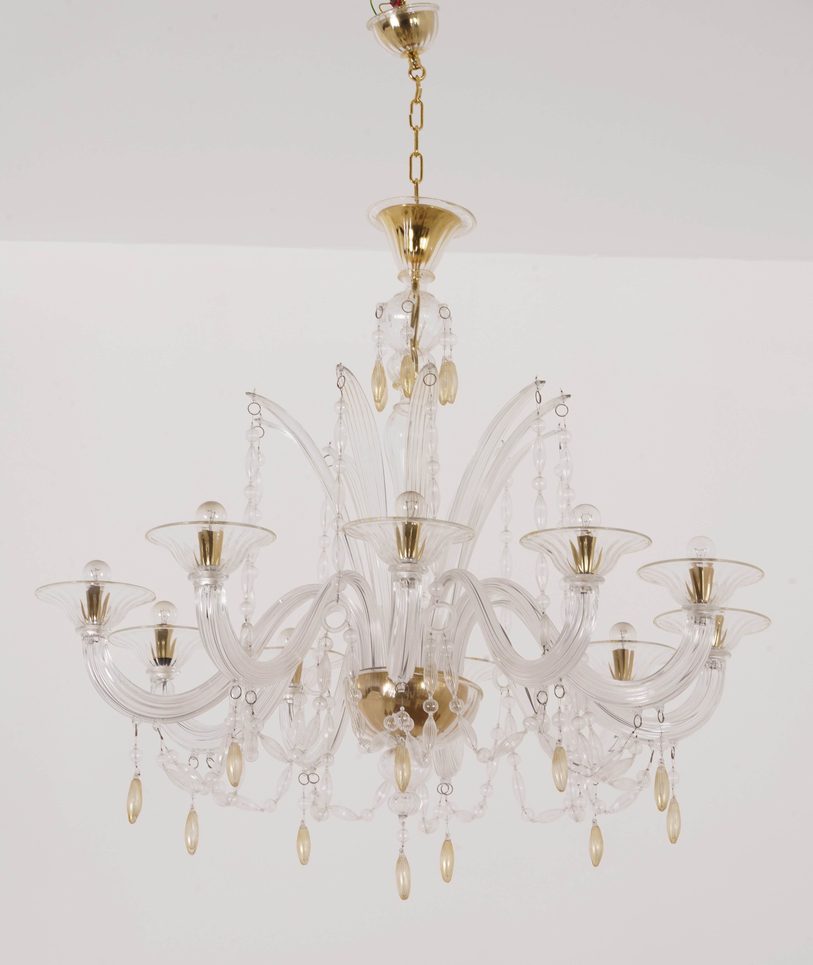 Lampadario a dieci braccia in vetro di Murano bianco e oro