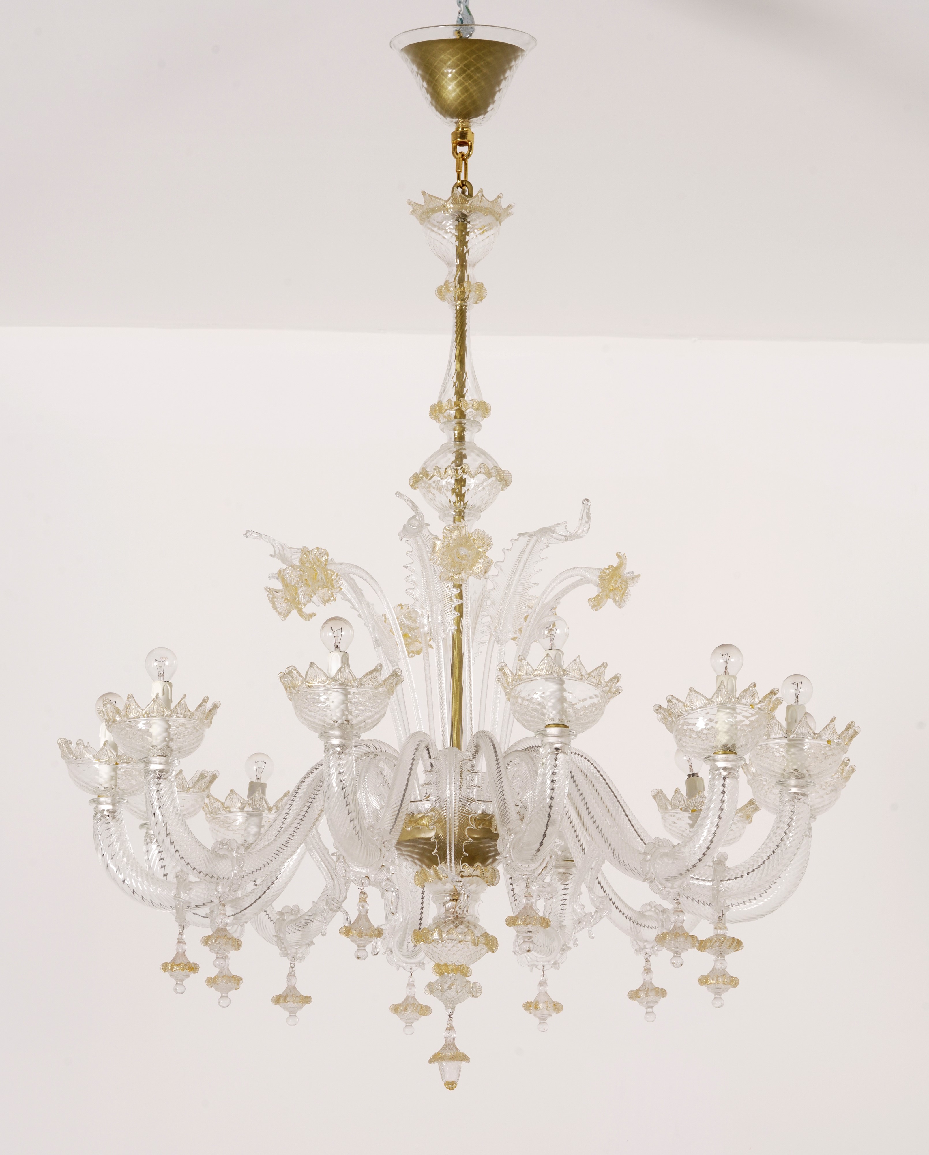 Lampadario a dodici braccia in vetro di Murano bianco e oro