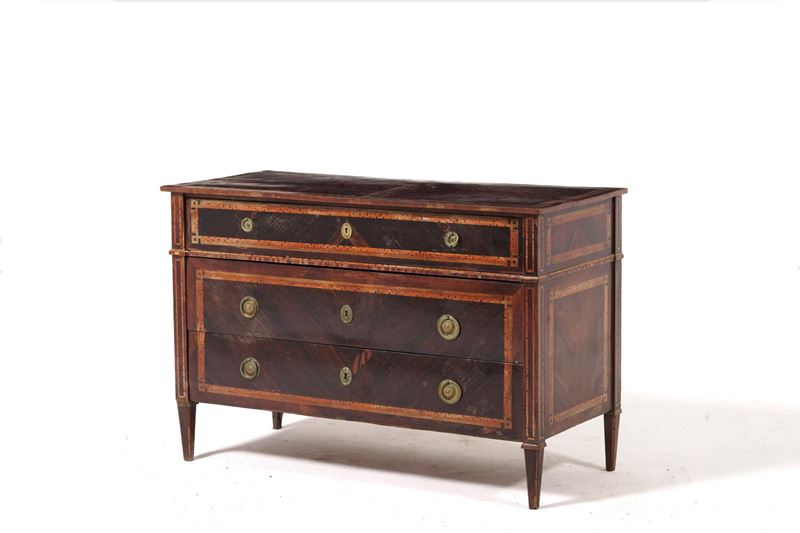 Cassettone Luigi XVI lastronato ed intarsiato. XVIII secolo