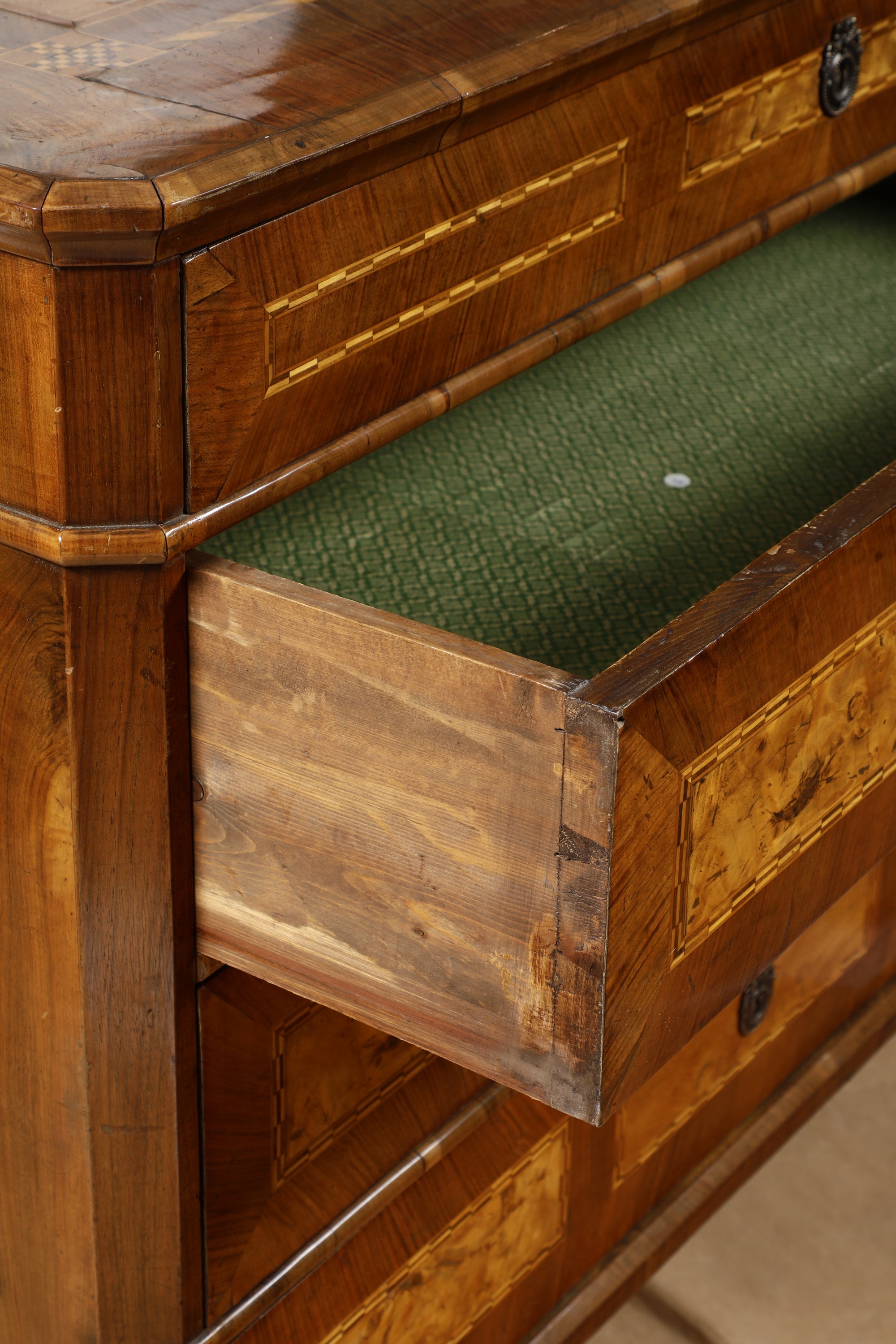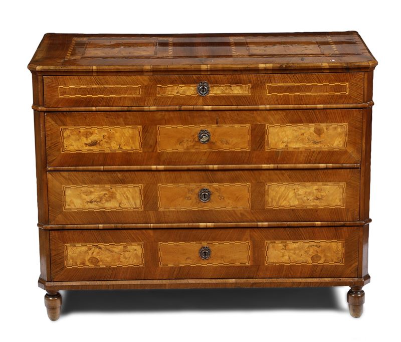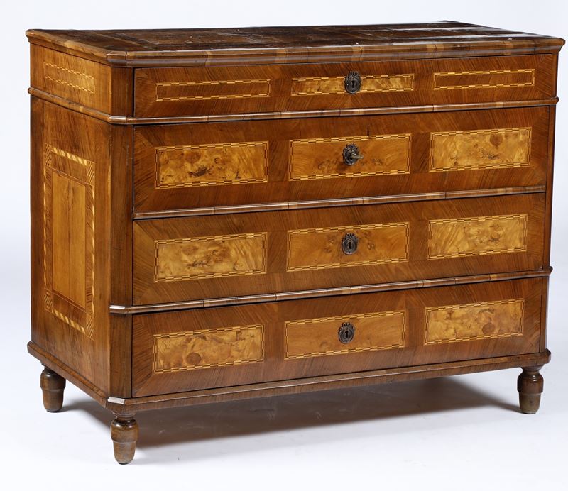 Comò in legno lastronato ed intarsiato a quattro cassetti. XIX-XX secolo