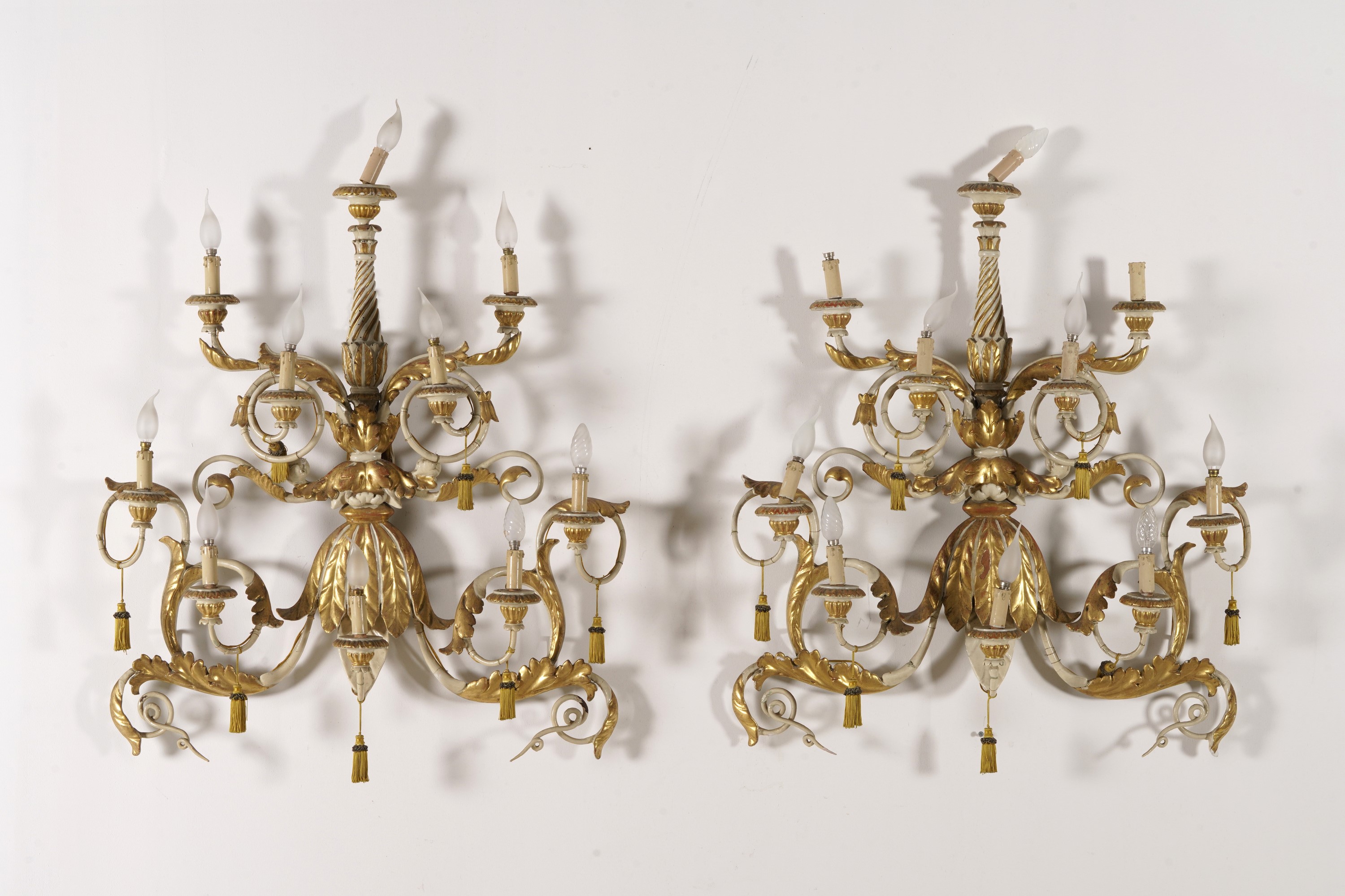Coppia di appliques in legno intagliato e dipinto. XX-XXI secolo