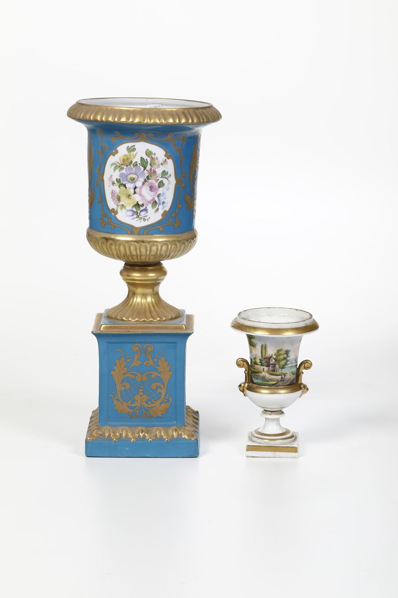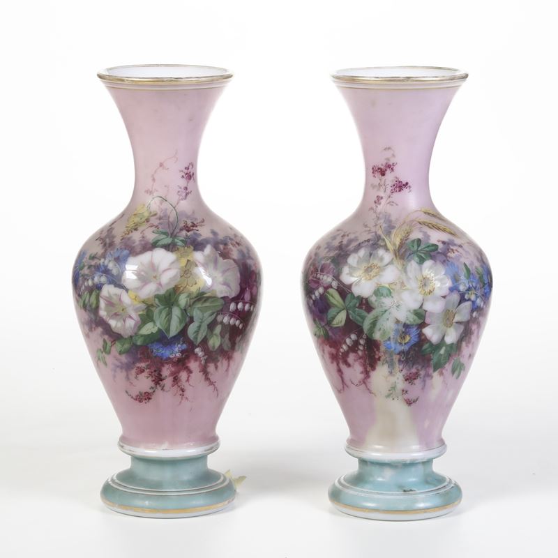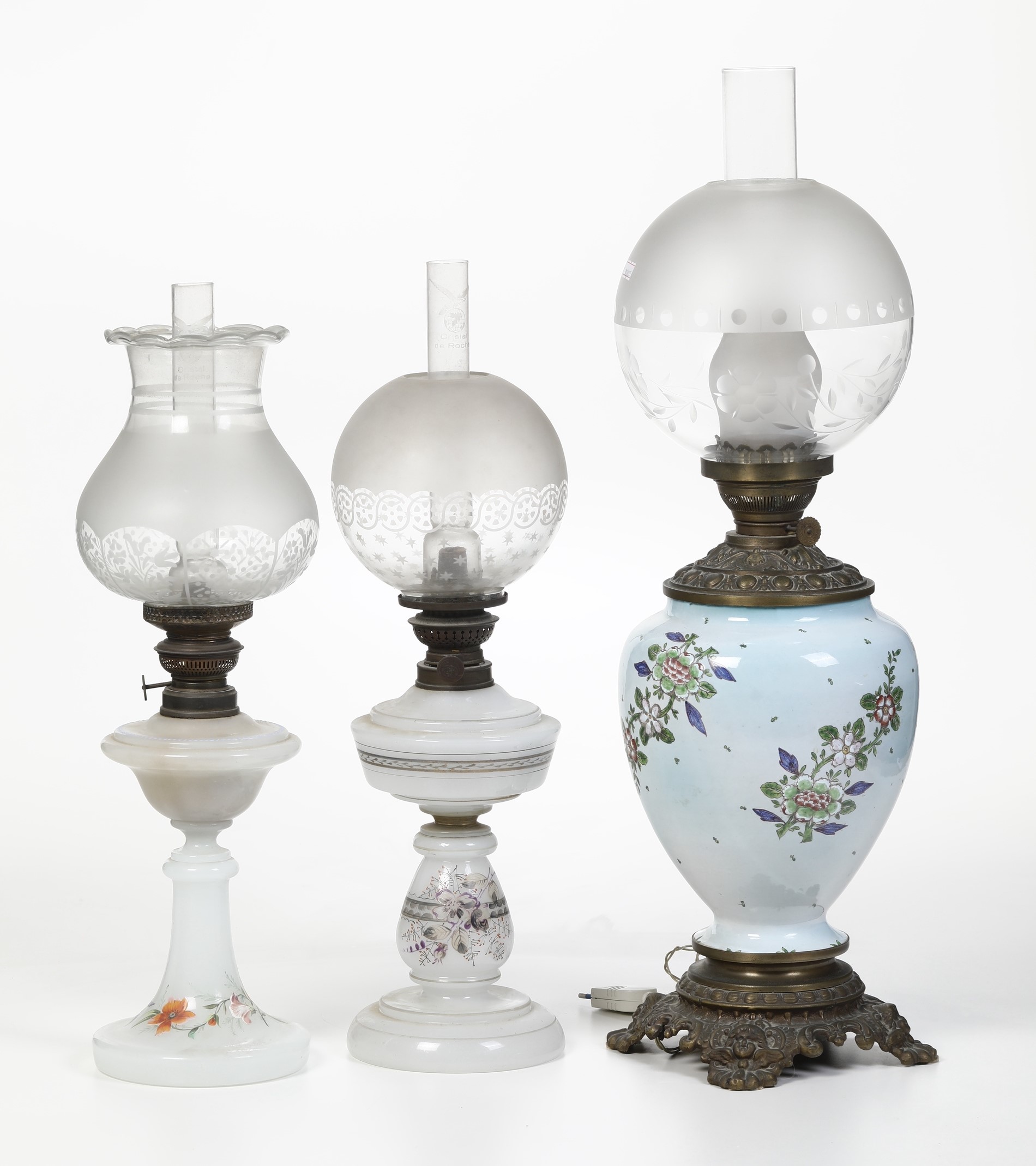 Insieme i tre lampade ad olio e quattro vasi in vetro e porcellana. XX secolo