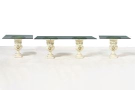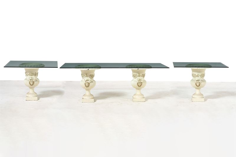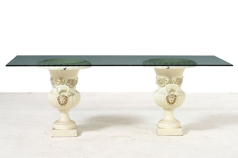 Tavolo con piano in vetro e sostegni a guisa di vasi medicei. XX secolo