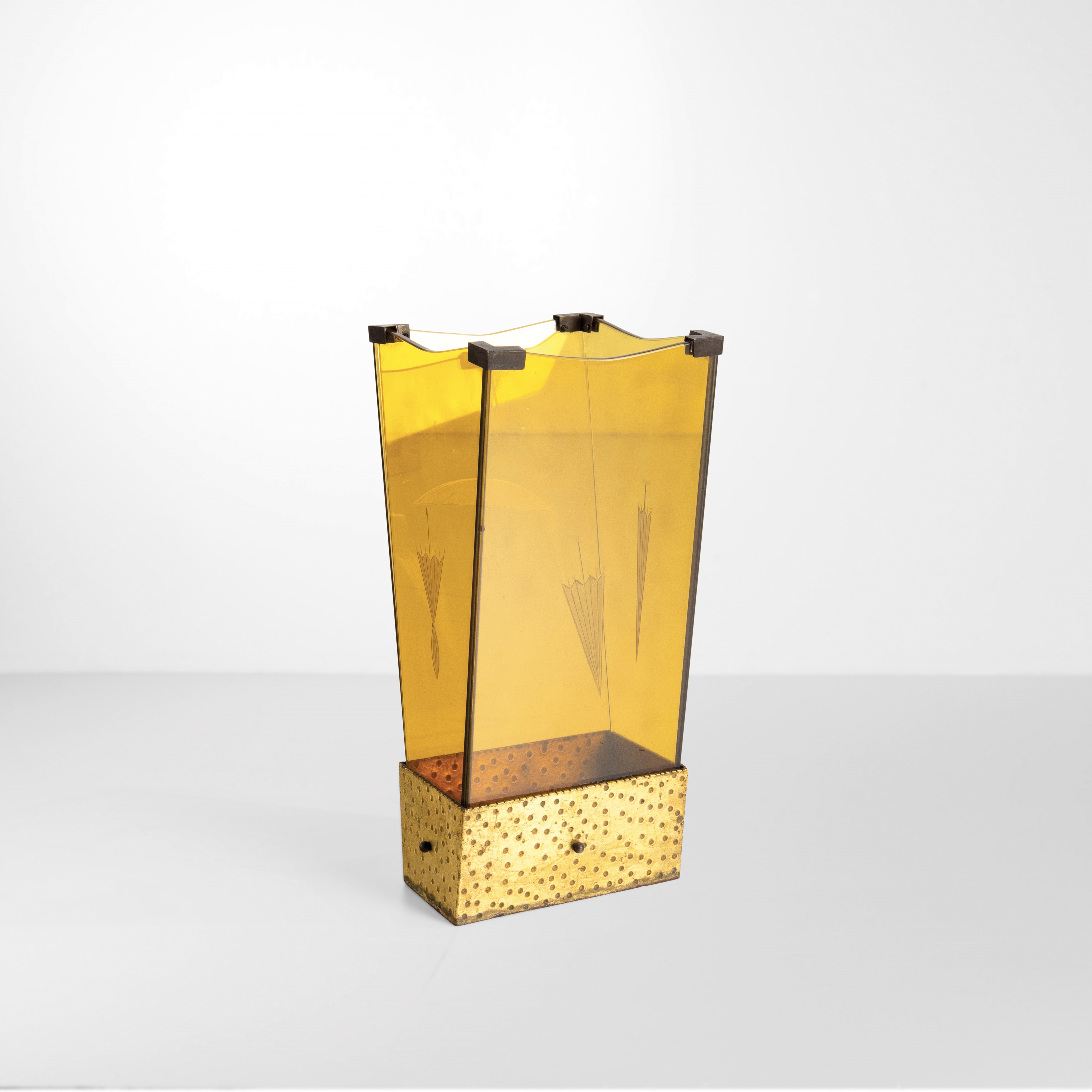 Struttura in cristallo colorato, molato e inciso con dettagli in ottone e metallo dorato.
