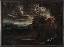 Scuola del XVIII secolo Paesaggio con architetture e figure