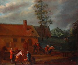 Scuola fiamminga del XVII secolo Paesaggio con popolani