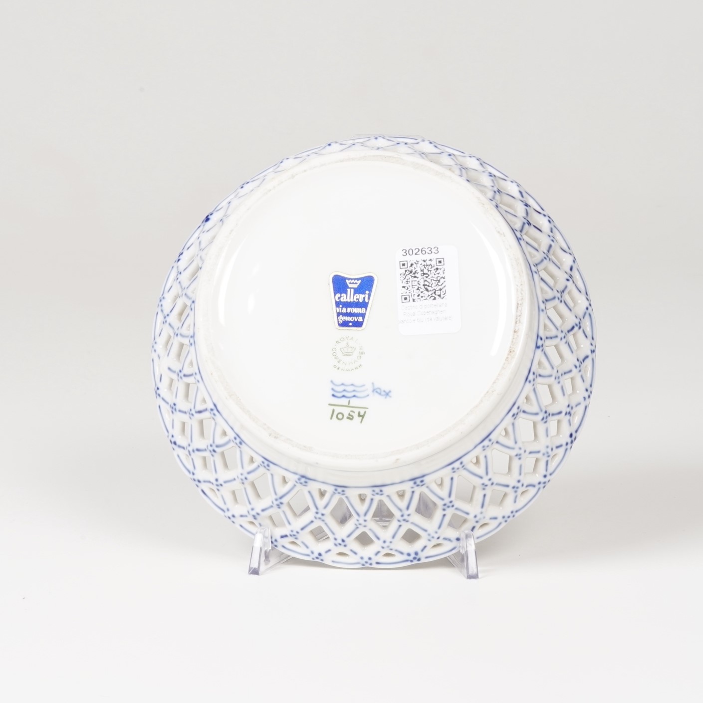 Porcellana. Marca: onde in blu e “Royal Copenhagen con corona in verde”. Dimensioni: altezza cm 8,2; diametro cm 19. Conservazione: ottima.