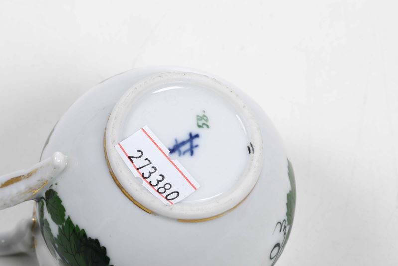 Le tazze dalla forma bombata e bordo estroflesso presentano il manico a forma di collo e testa di cigno. Sono decorate con il motivo a “foglia di vite” in uso a Meissen a partire dal 1817.