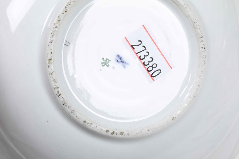 Porcellana. Marca: spade incrociate in blu. Dimensioni: altezza tazza cm 7,7; diametro piattino cm 13,8. Conservazione: usure all'oro; un piattino con piccole sbeccature al bordo.