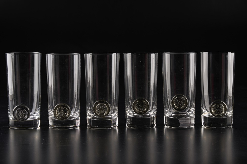 I sei tumbler alti da cocktail di questa serie sono chiamati “Piraten” per il motivo decorativo del medaglione.