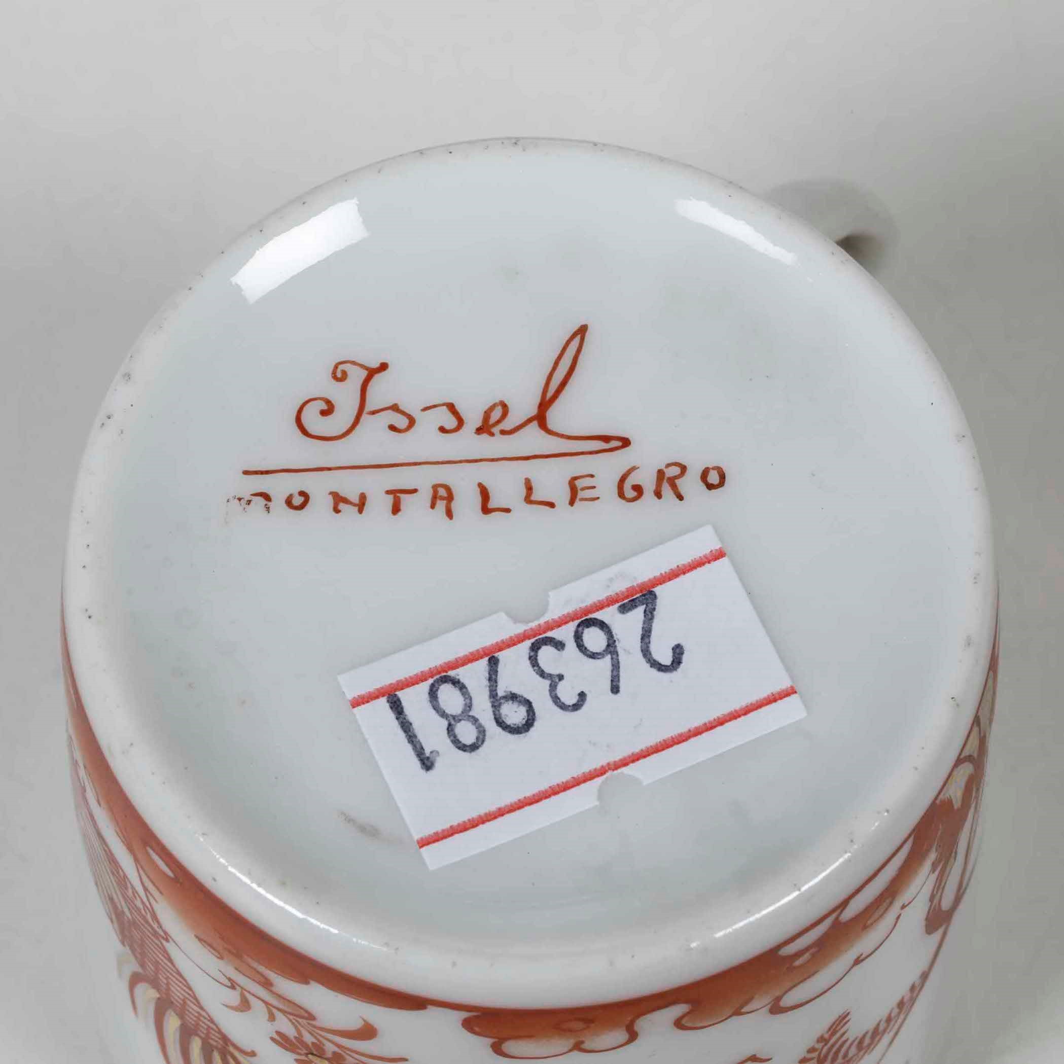 Porcellana. Marca: “Issel Montallegro” in rosso. Dimensioni: altezza tazza cm 4,8; diametro piattino cm 10,5.