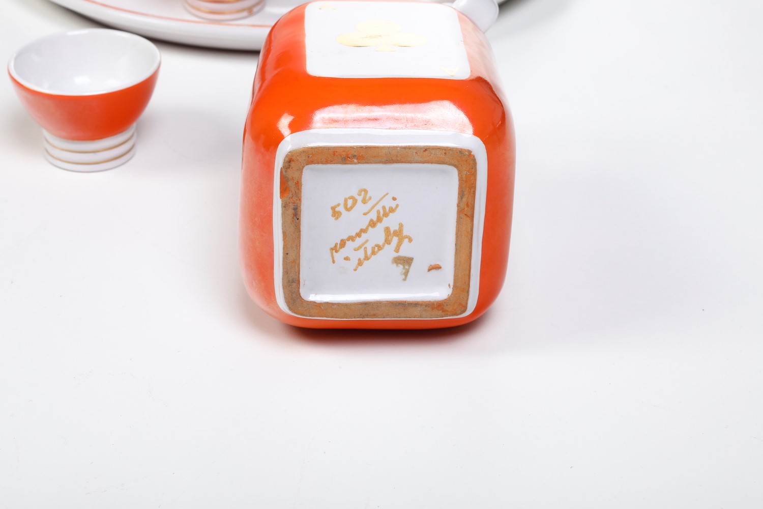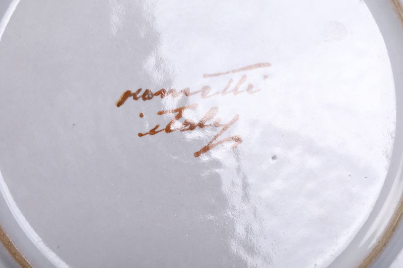 Terracotta. Marca: “Rometti Italy”. Conservazione: ottima; lievi usure allo smalto del vassoio; tappo della bottiglia mancante.