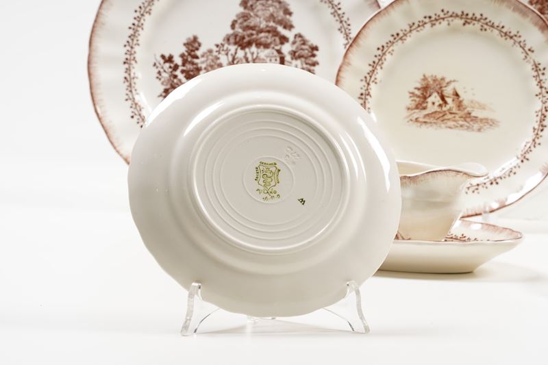 Il servizio per 12 persone conta 59 pezzi ed è così composto: 12 piatti fondi; 22 piatti piani (un piatto con sbeccatura incollata); 12 piatti da dessert (un piatto con difetto di cottura sul retro); 9 piatti da antipasto; 2 salsiere (una salsiera con felatura); 2 vassoietti.