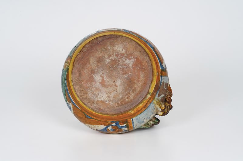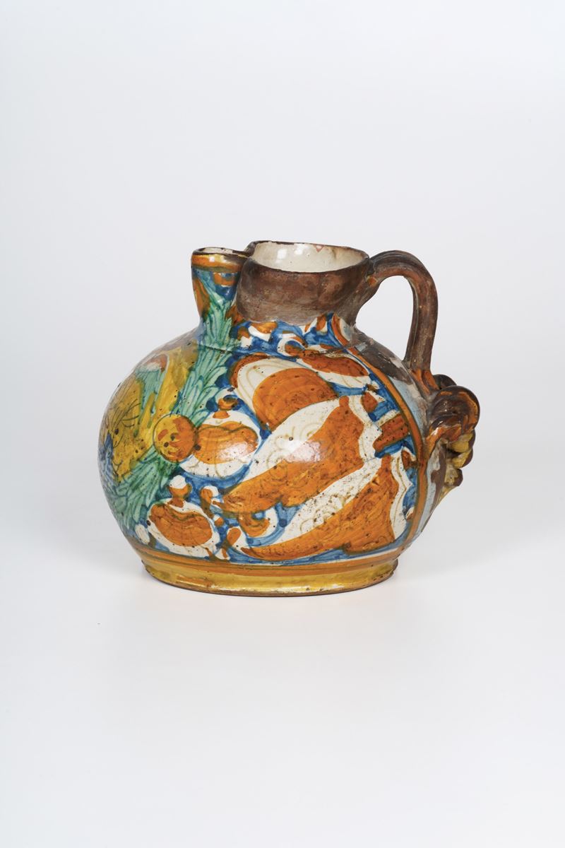 Maiolica. Altezza cm 19,5. Conservazione: estese cadute di smalto sul verso in particolare al manico e al collo.