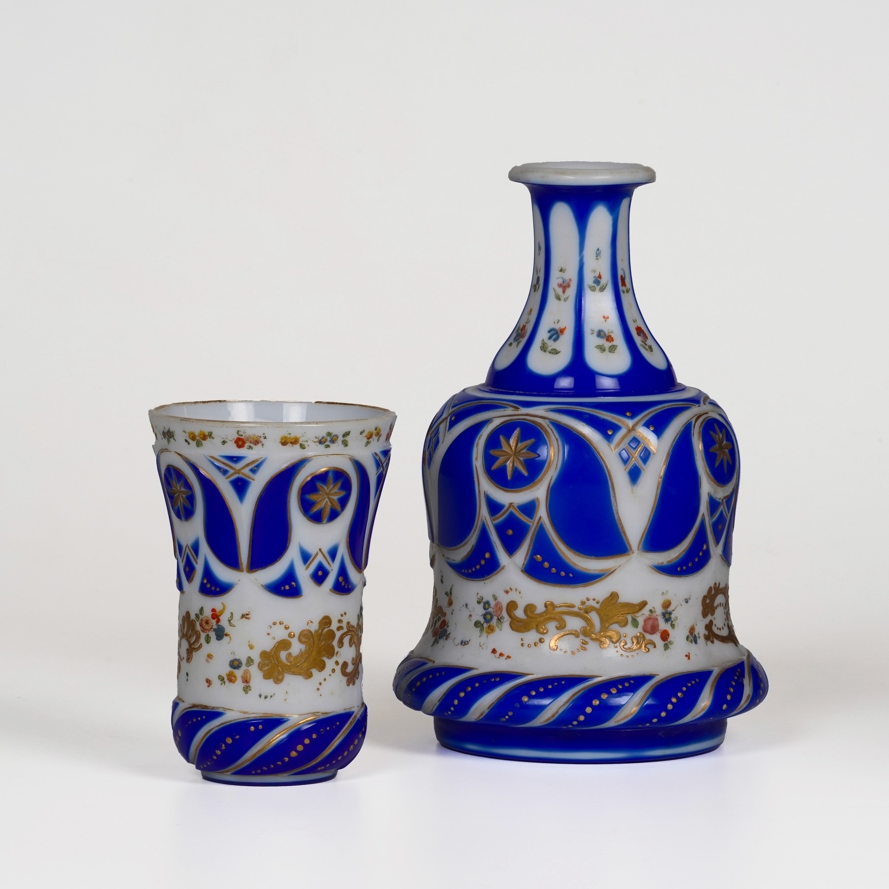 Vetro lattimo e blu. Marca: assente. Altezza totale cm 23. Conservazione: bottiglia con felatura sotto la base e sbeccatura al bordo; bicchiere con sbeccatura al bordo superiore; usure all'oro e leggere alla policromia.