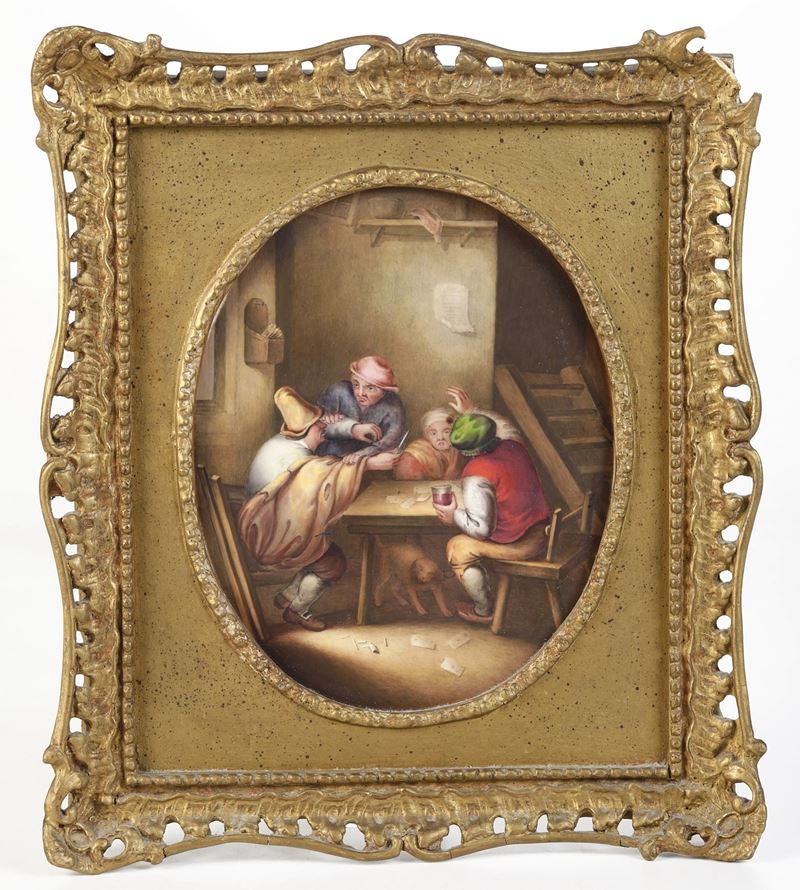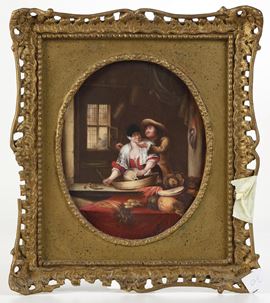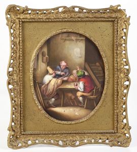 Porcellana incorniciata. Marca: pseudo marca di Sèvres. Dimensione cornice: cm 29x25,4. Conservazione: ottima per la porcellana; mancanze alle cornici.