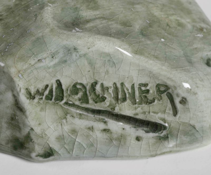 Terraglia. Marca: assente o non visibile; firma dell’esecutore. Altezza cm 35,6. Conservazione: rottura incollata all’attacco tra la zolla della base e la gamba.