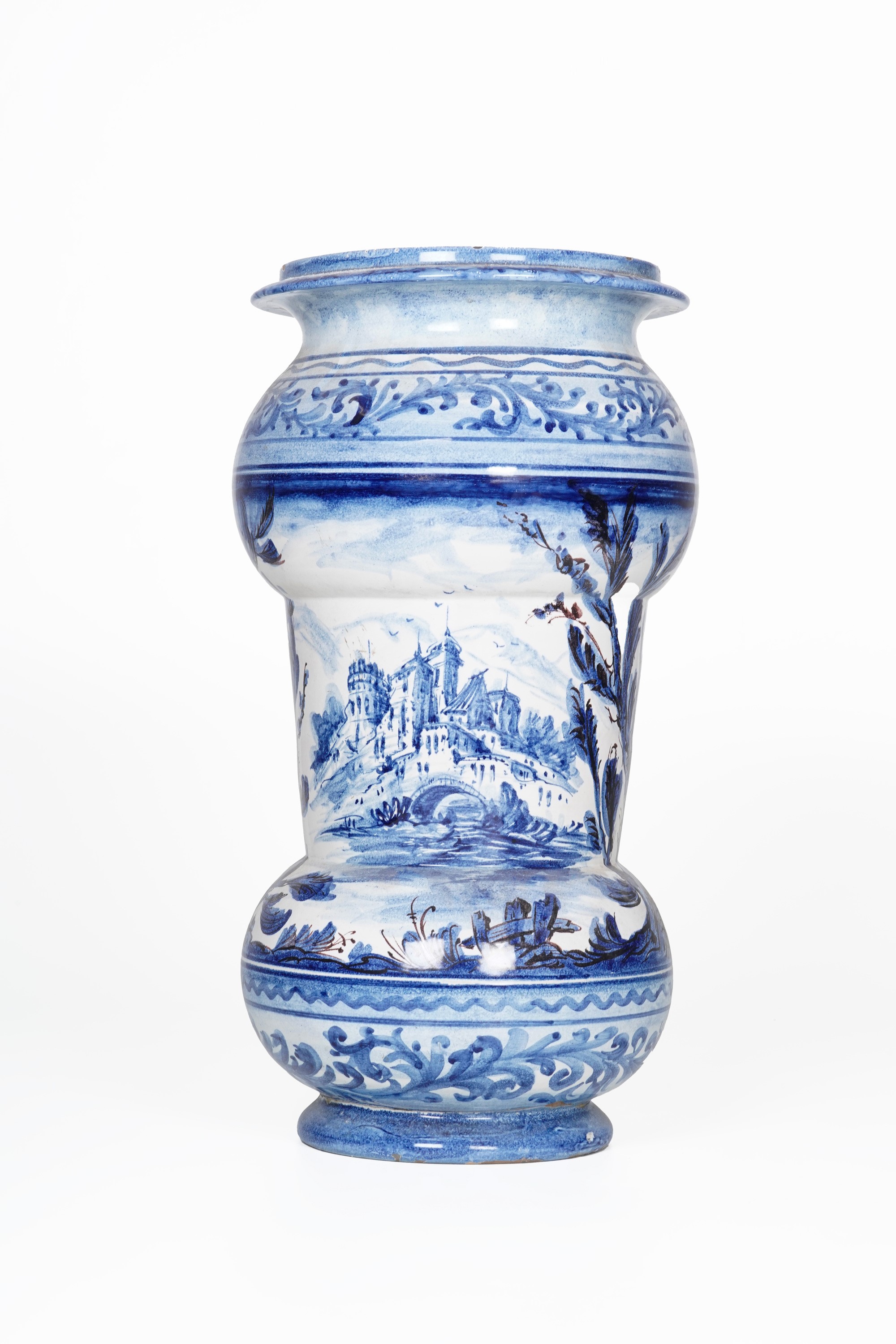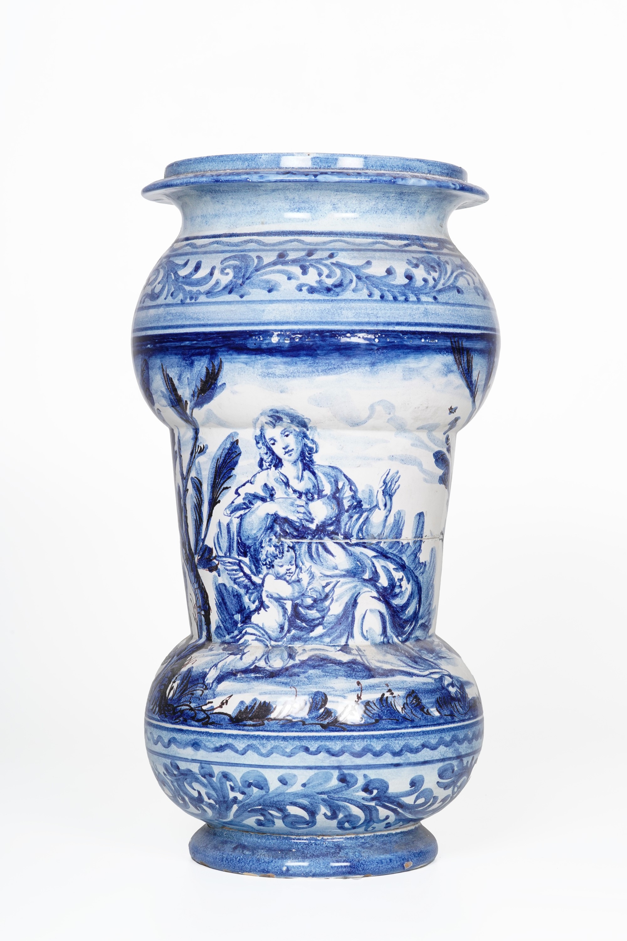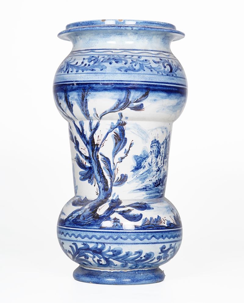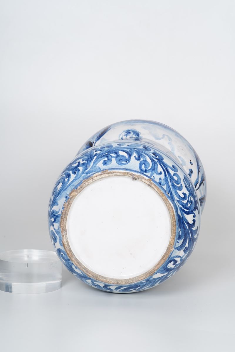 Maiolica. Marca: assente. Altezza cm 51; diametro cm 25 circa. Conservazione: ottima; una felatura di cottura; minime sbeccature al bordo superiore e inferiore.