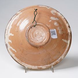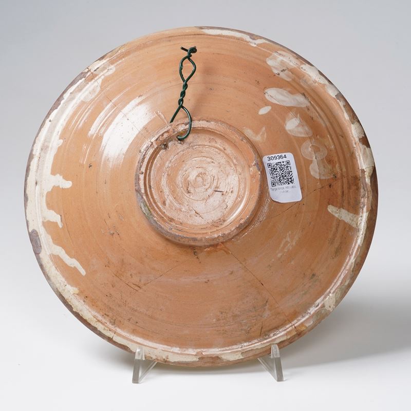 Maiolica policroma a gran fuoco. Diametro cm 27,6. Conservazione: rotto in quattro frammenti e ricomposto.