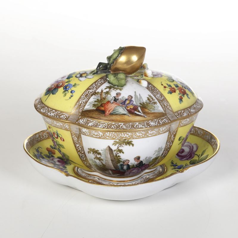 La zuppierina con il suo coperchio e sottopiatto è decorata con scene a Watteau alla maniera di Meissen del XVIII secolo.