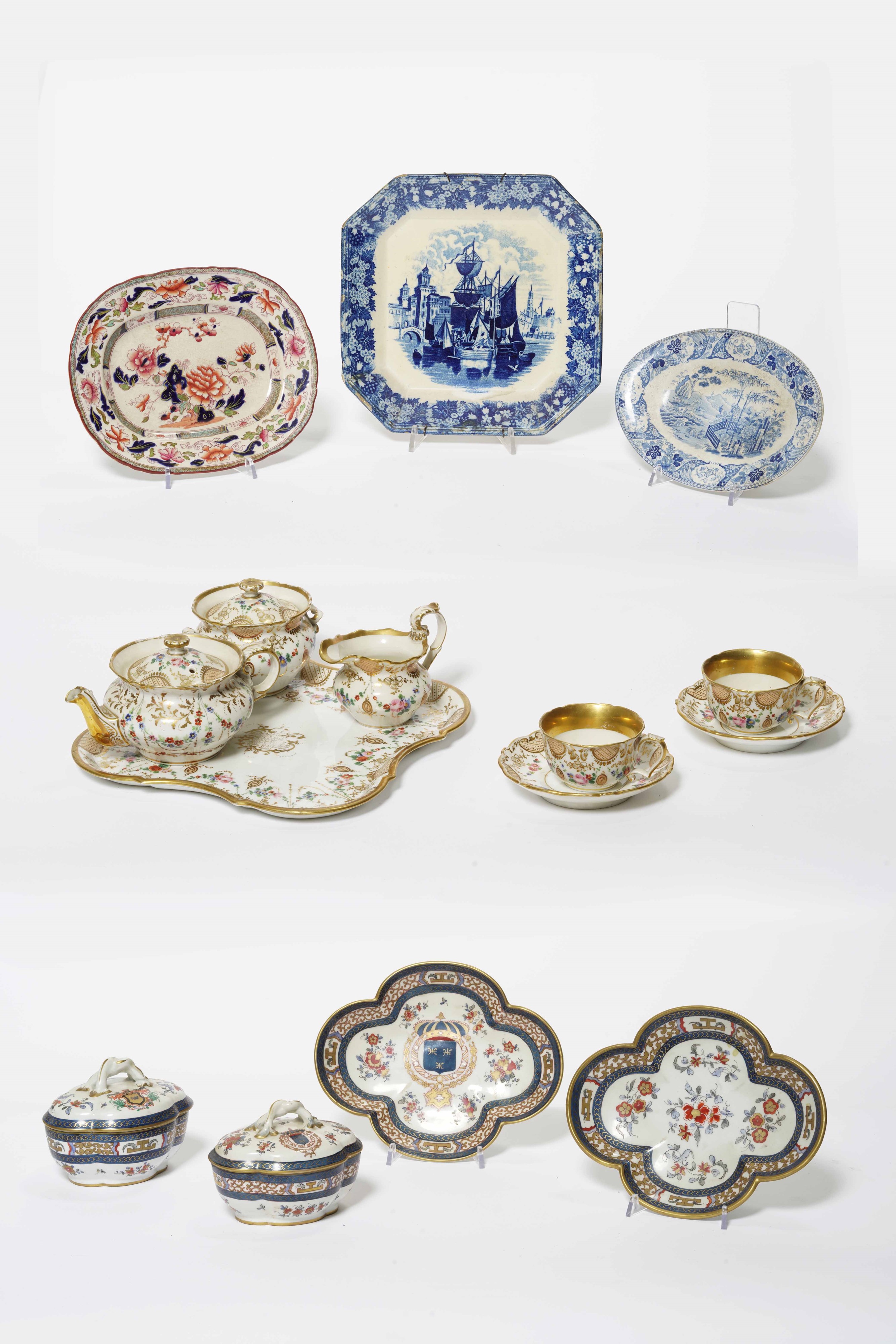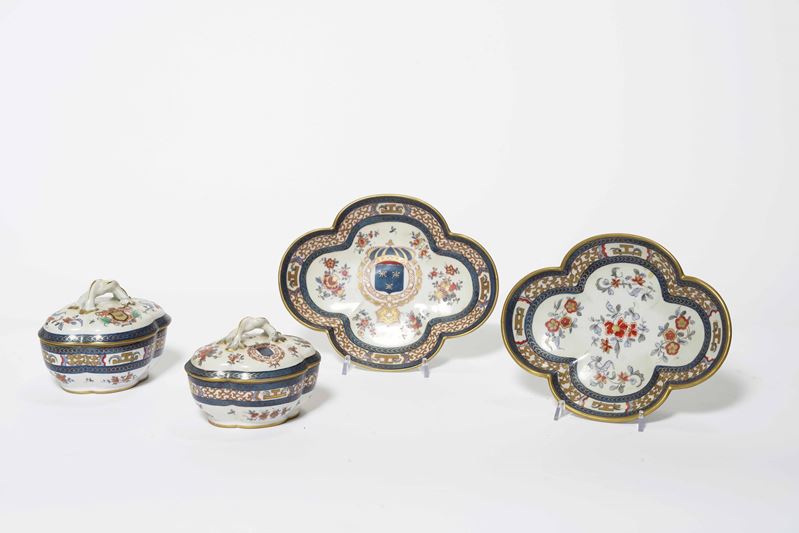 Al lotto si aggiungono: 3 vassoietti in terraglia inglese; due scatole quadrilobate con coperchio e vassoietto in porcellana di Parigi, inizio XX secolo.