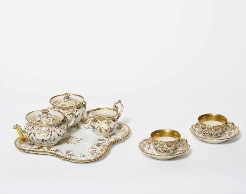 Porcellana. Marca: assente. Conservazione: buona; piccola sbeccatura al beccuccio della teiera; insignificanti usure all’oro.