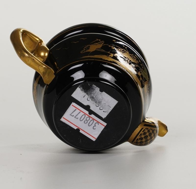 Vetro ilalite. Altezza cm 7,5. Conservazione: piccole sbeccature al beccuccio; insignificanti usure all'oro; coperchio non pertinente.