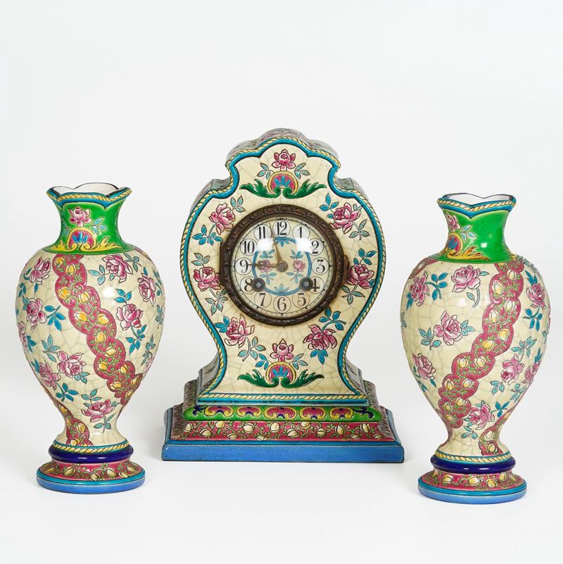 Terraglia. Marca: "Longwy" impresso. Altezza orologio cm 25. Conservazione: buona; un vaso con restauro nella parte inferiore all'attaccatura delle base.
