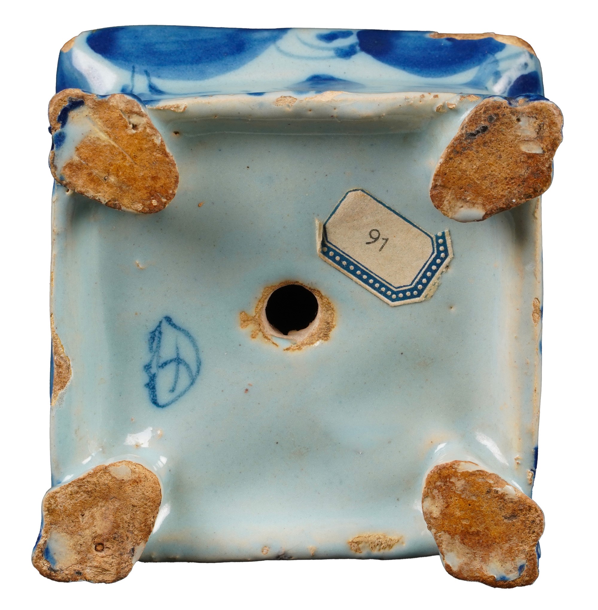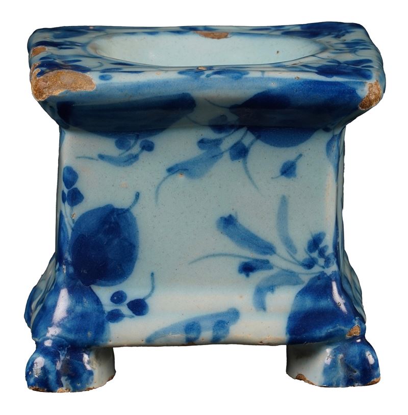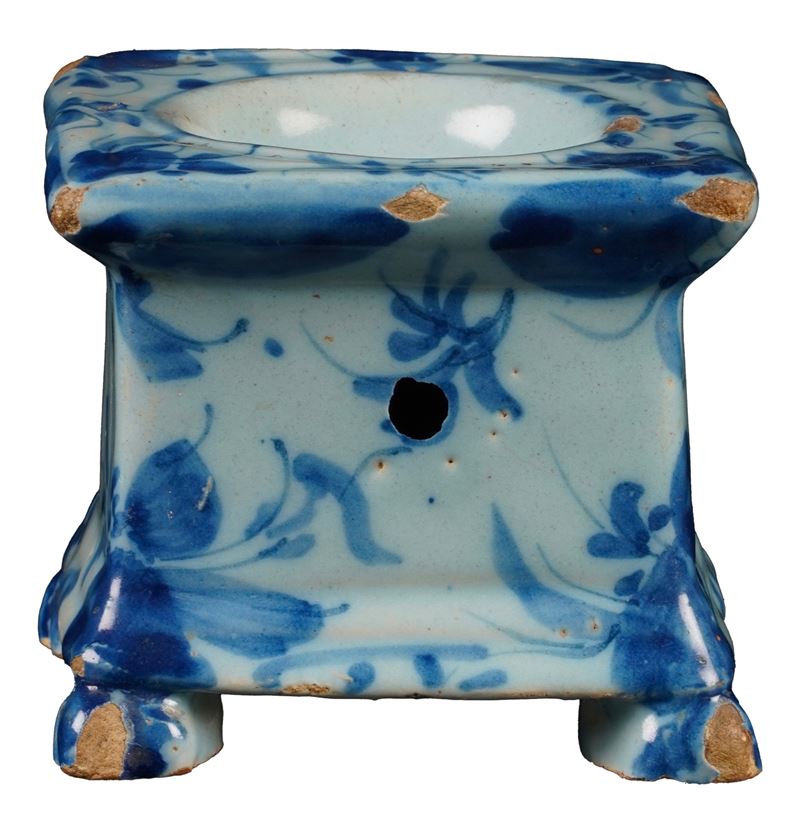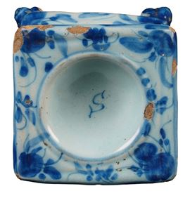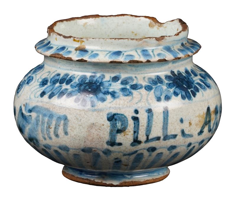 Maiolica. Marca: stemma di Savona. Altezza massima cm 7,5. Conservazione: buona; sbeccature e salti di smalto.