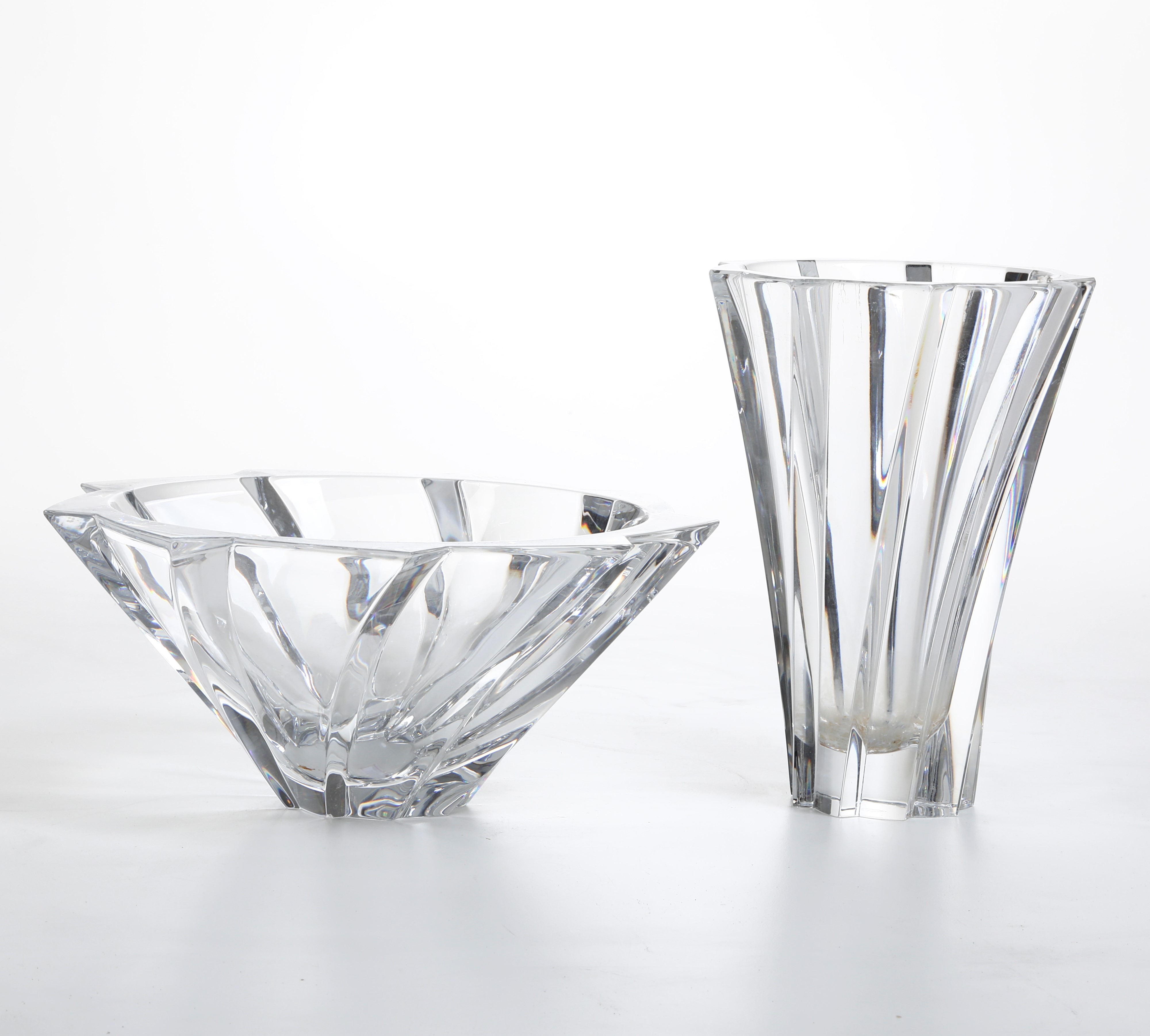 Cristallo. Marca: “Baccarat” inciso e simbolo grafico con “Baccarat France" inciso all’acido. Vaso: altezza cm 21. Ciotola: altezza cm 12, diametro cm 26. Conservazione: vaso e ciotola con insignificante sbeccatura al bordo inferiore.