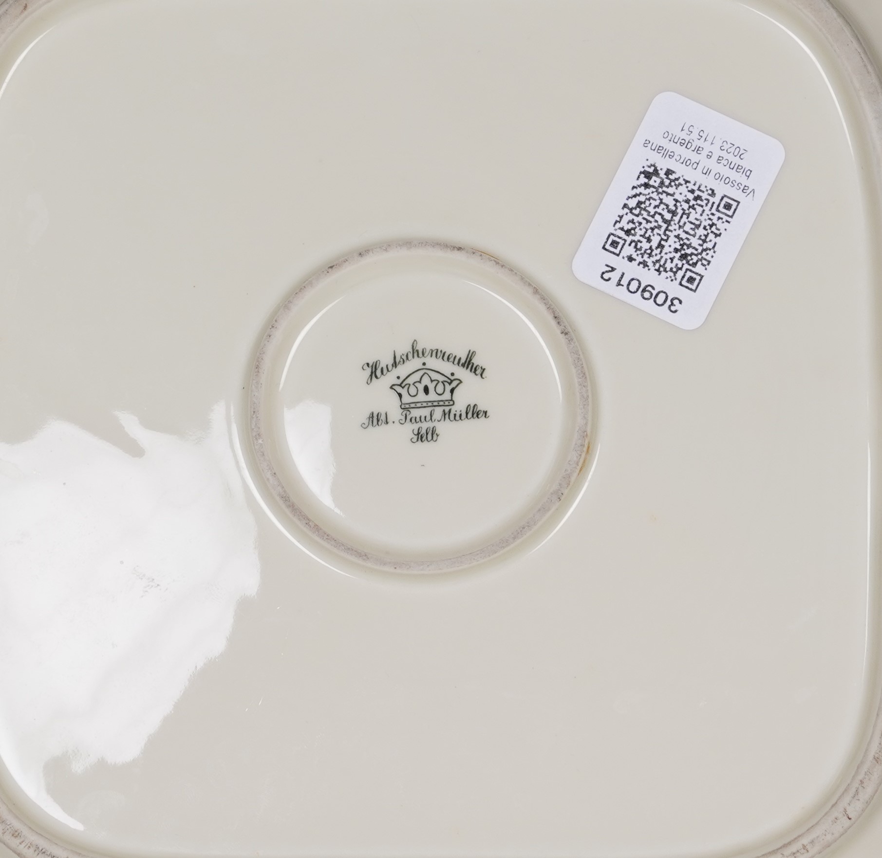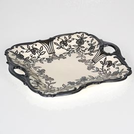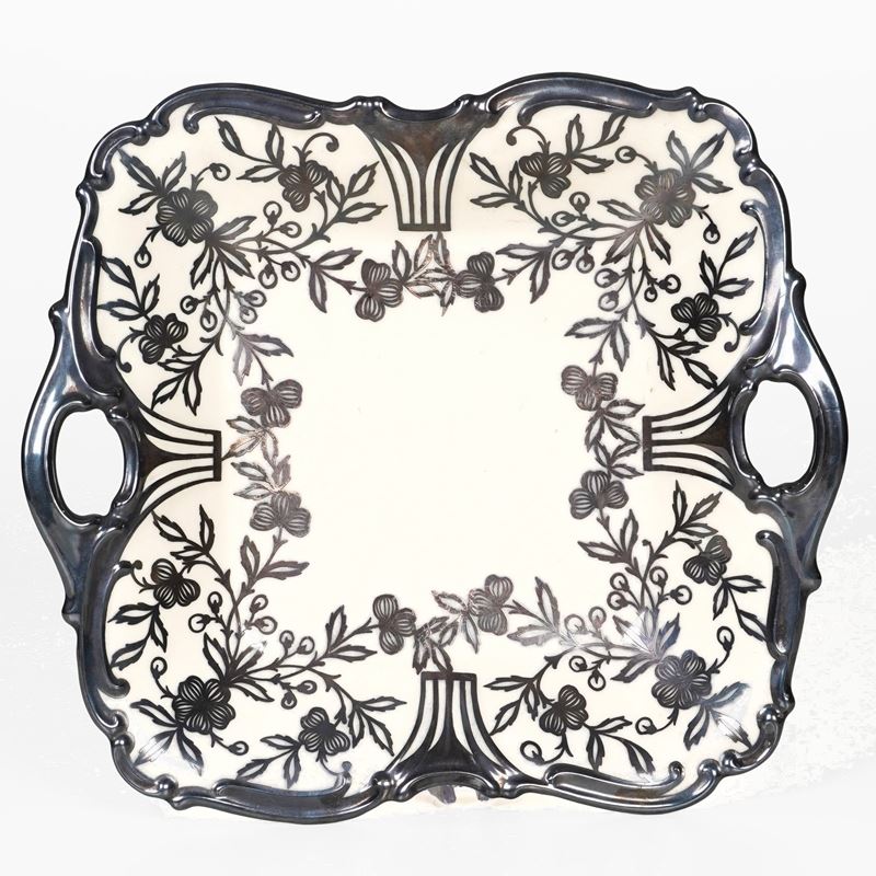Porcellana decorata in argento. Marca: sibolo grafico della manifattura. Dimensioni cm 30,8x27,7. Conservazione: ottima.