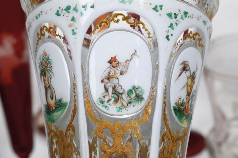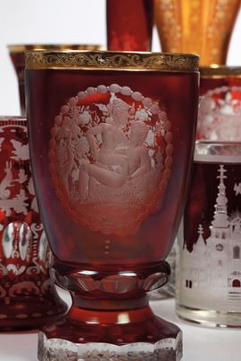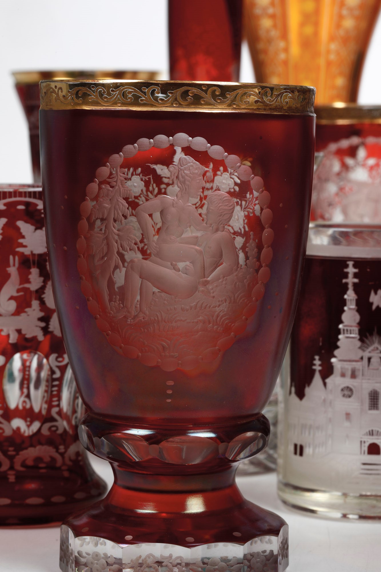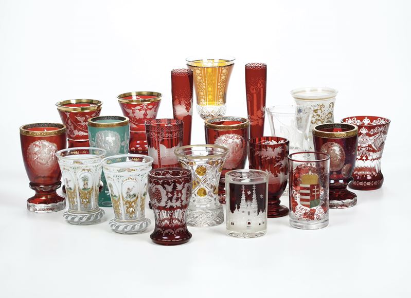 Venti bicchieri di cui una coppia con motivi erotici. Boemia, XIX e inizio XX secolo.