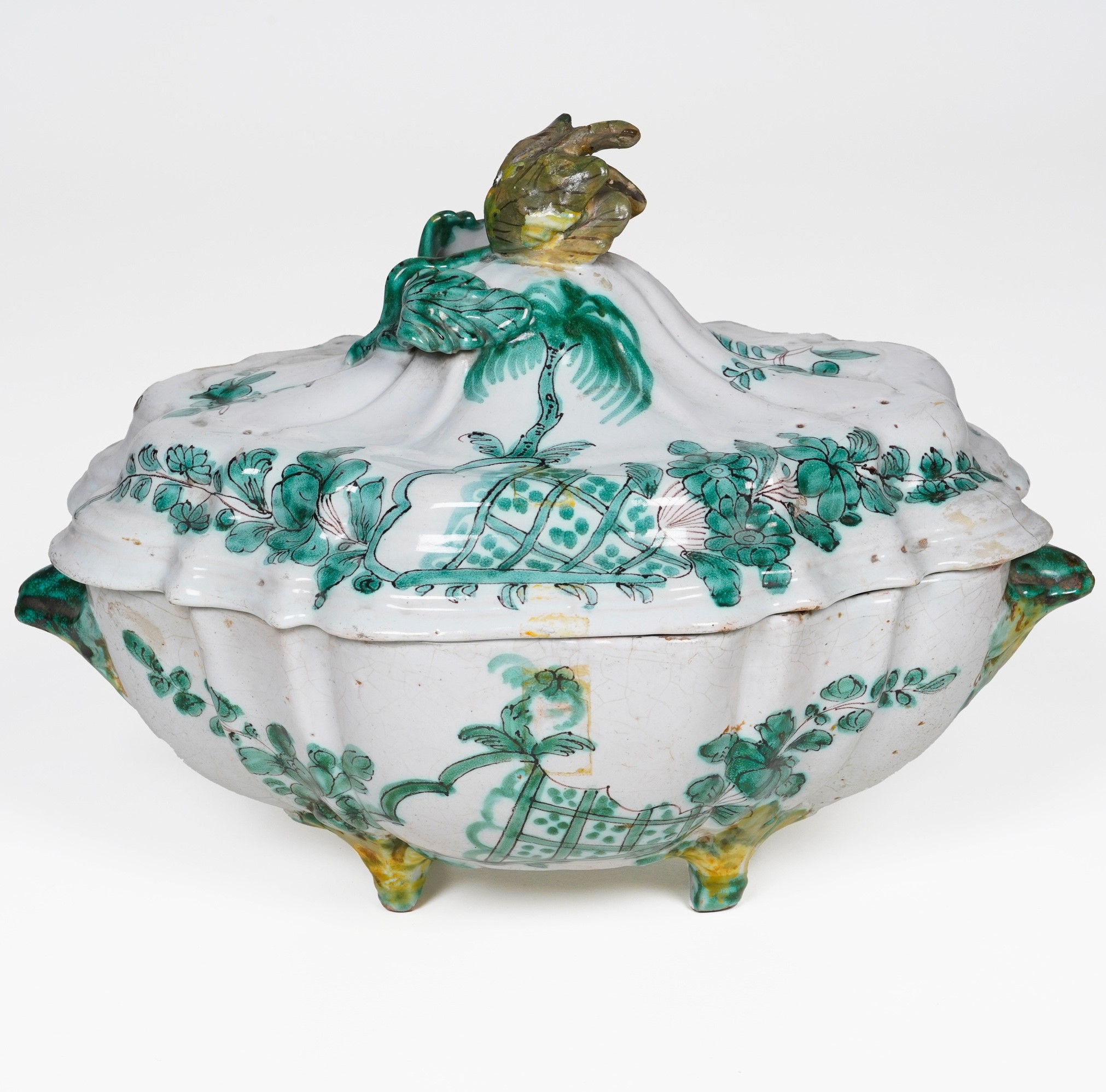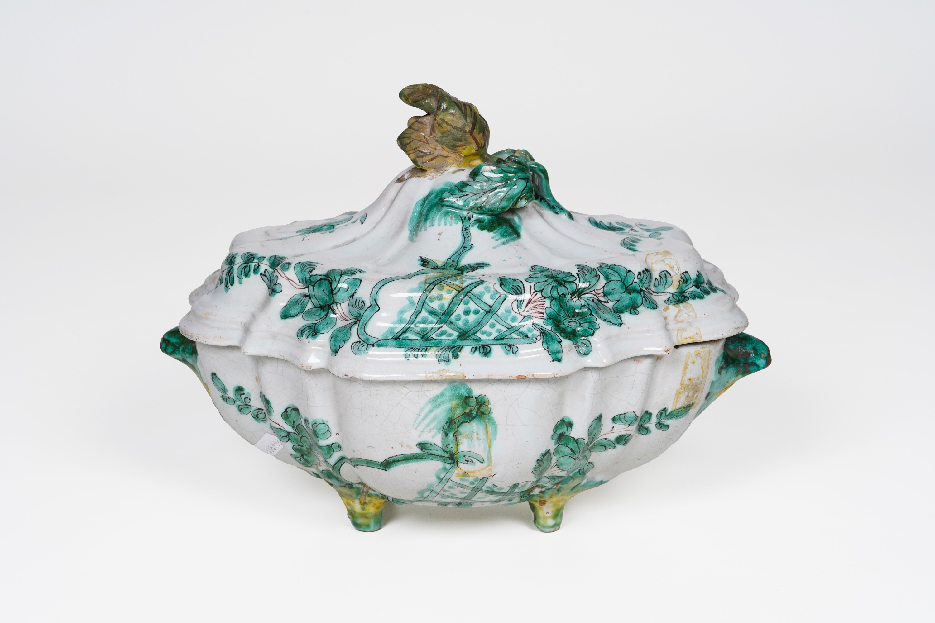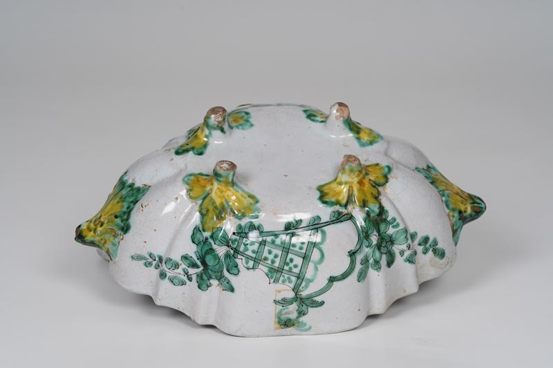 Maiolica. Marca: assente. Dimensioni: altezza cm 23,5; cm 32,8x22,5. Conservazione: corpo con craquellures e insignificanti sbeccature; coperchio con presa restaurata, due minime felature e piccole sbeccature ai bordi.