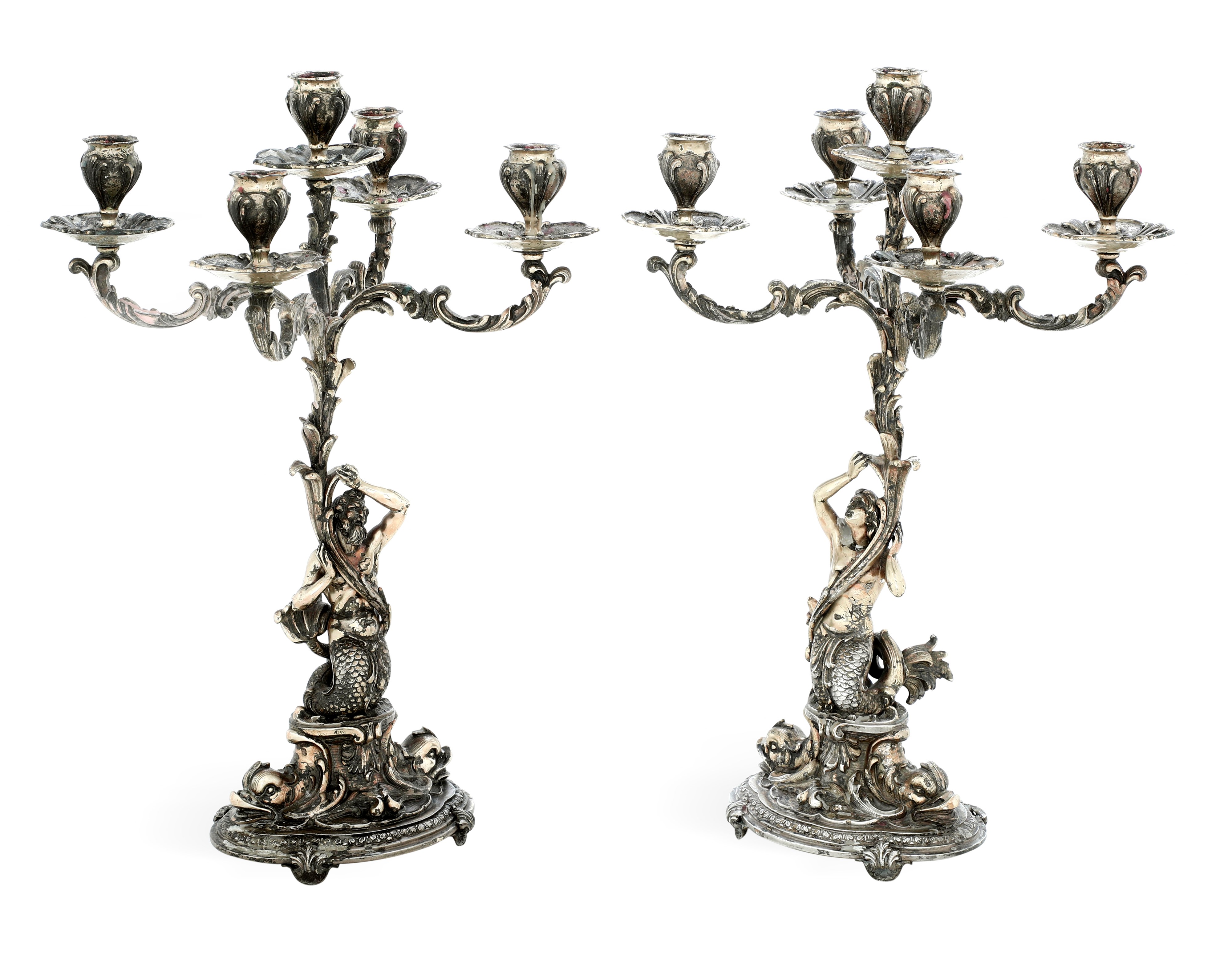 elaborata composizione di gusto neobarocco con piede a rocaille e fusto a foggia di tritone e sirena