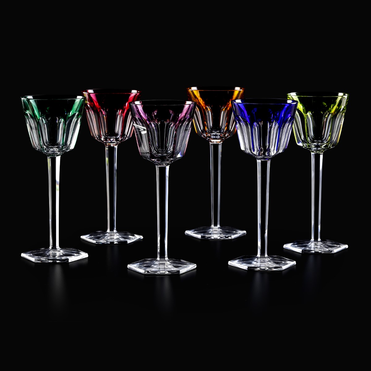 I calici Harcourt per vino alsaziano sono eseguiti in doppio cristallo, uno trasparente e uno colorato posto all’esterno dei calici. Virtuosismo raggiunto da ben poche manifatture che, con questa raffinatissima tecnica, dona un magnifico gioco di colori ai calici