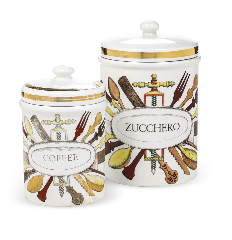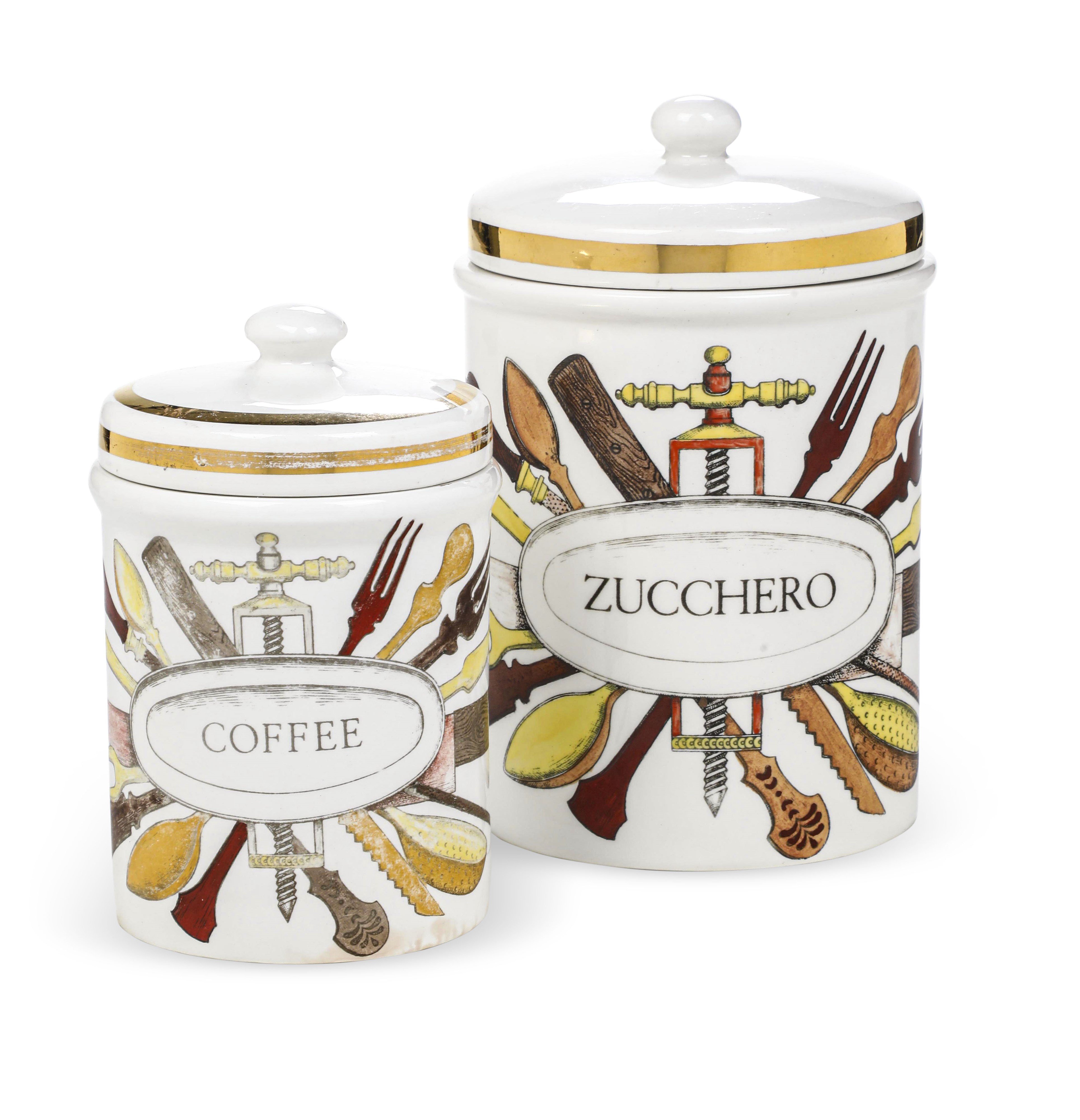 I vasi con coperchio serigrafati in policromia sono destinati a contenere zucchero e caffè