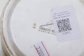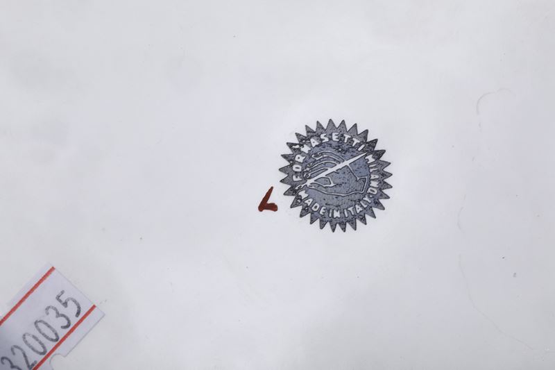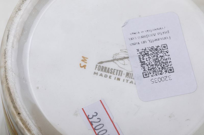Terraglia. Marca: simbolo grafico con "Fornasetti Milano Made in Italy". Altezza cm 22; cm 17,5. Conservazione: ottima; insignificanti usure all'oro