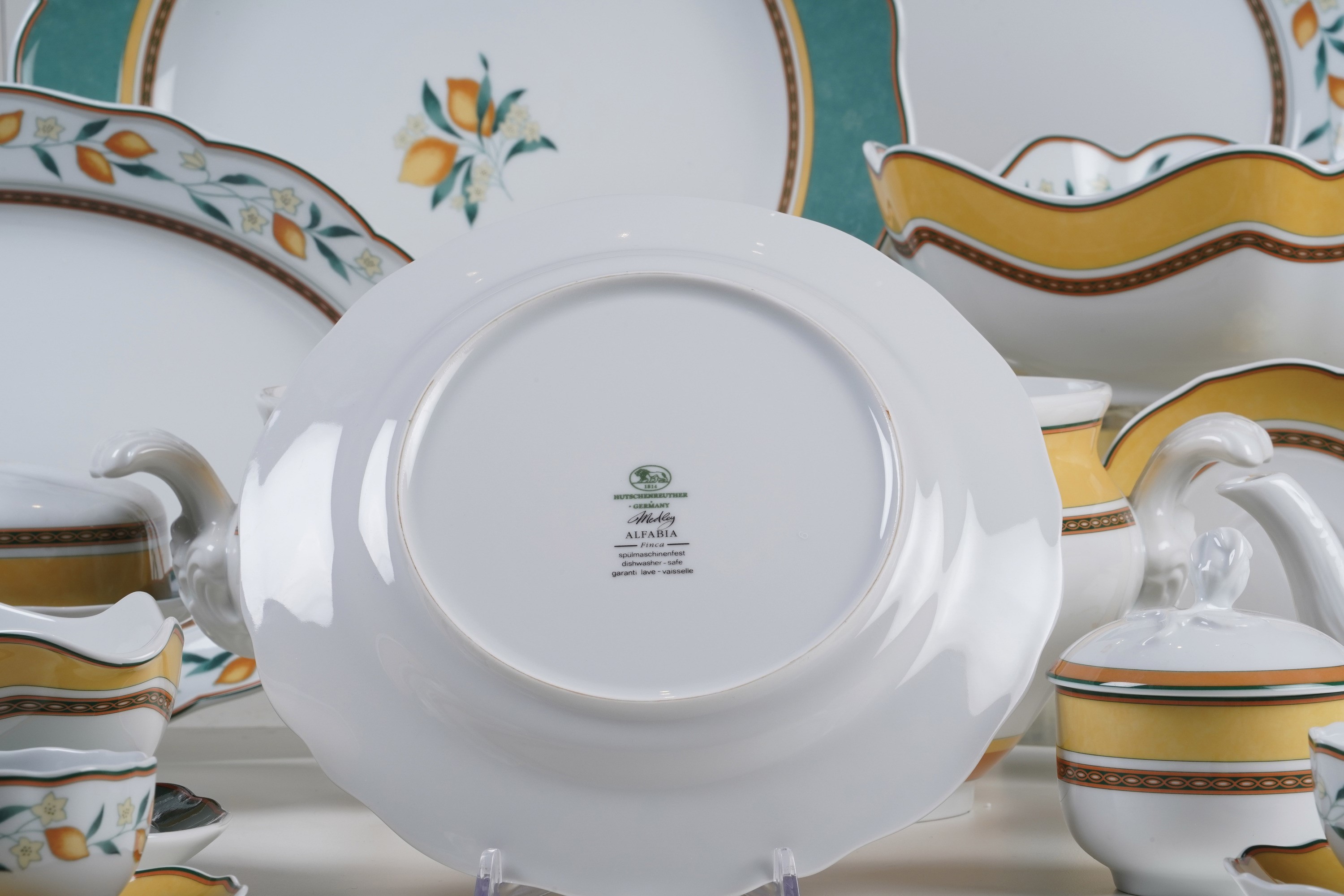 Porcellana. Marca: simbolo grafico con leone e data "1814", "Hutschenreuther Germany" in verde; Medley Alfabia in nero. Conservazione: ottima (vedi elenco)