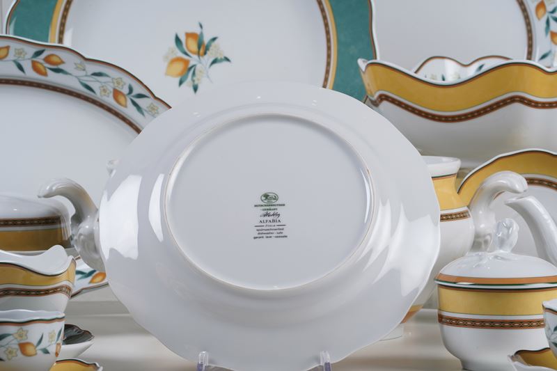 12 piatti fondi (diametro cm 21); 24 piatti piani (diametro cm 24,5); 24 piatti da antipasto (diametro cm 18,5); 12 ciotole (diametro cm 15); 1 zuppiera (lunghezza cm 38; altezza cm 26); 1 salsiera (lunghezza cm 21); 2 insalatiere (lunghezza cm 21; cm 25); 2 piatti da portata tondi (diametro cm 30); 2 piatti da portata ovali (lunghezza cm 35; cm 39);