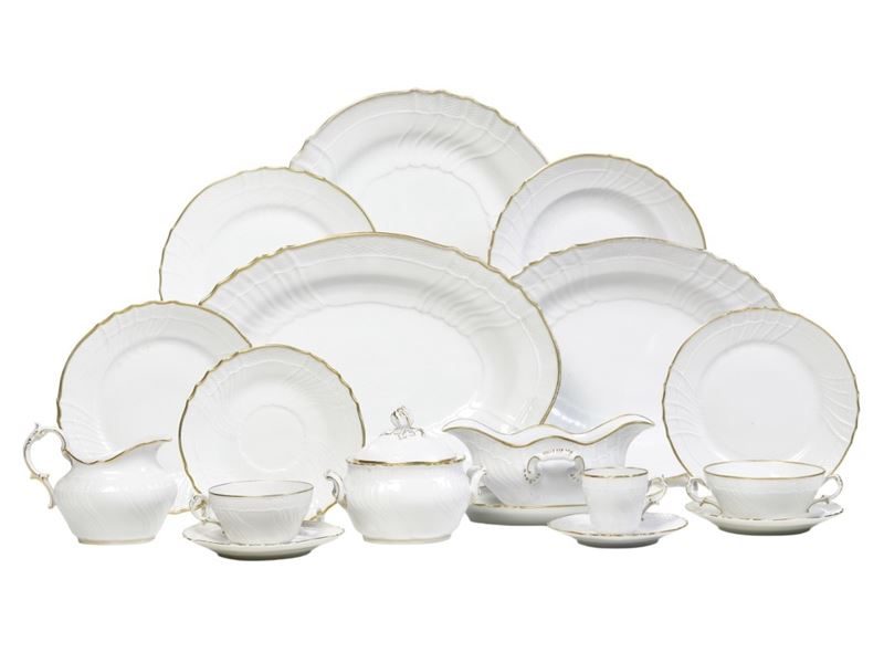 Il servizio per 11 persone più riserve, conta 102 pezzi ed è così composto: 11 piatti fondi (diametro cm 24); 23 piatti piani (diametro cm 23,5); 24 piatti da antipasto (diametro cm 19,5); 12 piatti da dessert (diametro cm 21); 12 tazze da brodo con sottopiatto (altezza tazza cm 5; diametro sottopiatto cm 18); 1 salsiera; 1 piatto da portata tondo (diametro cm 33); 3 piatti da portata ovali (cm 39x37; cm 34,5x25,5; cm 33,5x24,7); 8 tazze da caffè con 6 piattini (altezza tazza cm 5,3; diametro piattino cm 13); 6 tazze da tè con piattino (altezza tazza cm 5,3; diametro piattino cm 14); 1 teiera senza coperchio (altezza cm 12); 1 lattiera (altezza cm 11); 1 zuccheriera (altezza cm 12)