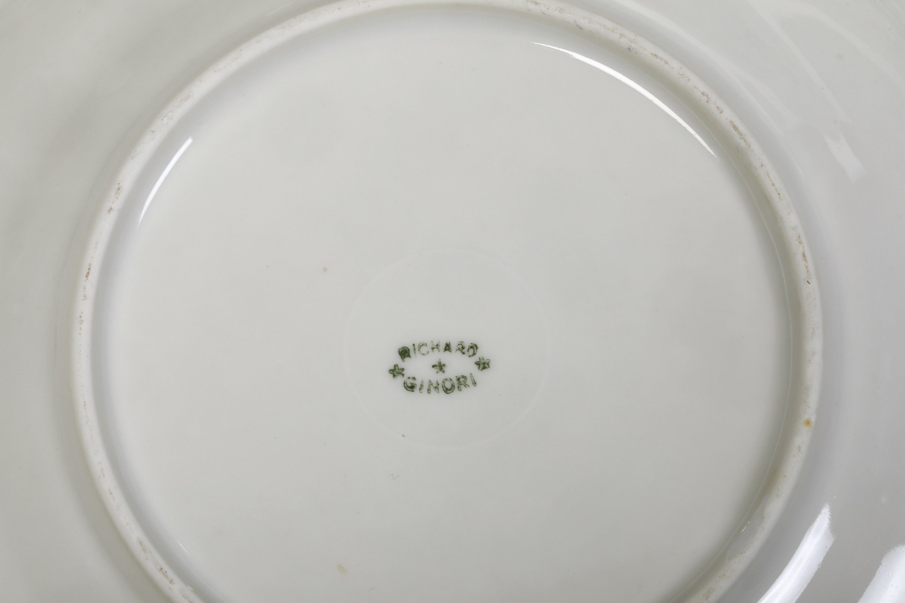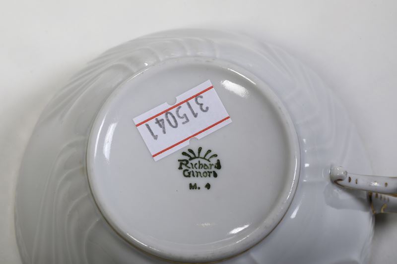 Porcellana. Marca: “Richard Ginori” con corona in verde. Conservazione: ottima; Conservazione: 1 piatto da portata ovale con sbeccatura; 1 sottopiatto di una tazza da brodo con sbeccatura; 1 tazza da tè con manico restaurato; 1 tazza da caffè e un piattino con insignificante sbeccatura