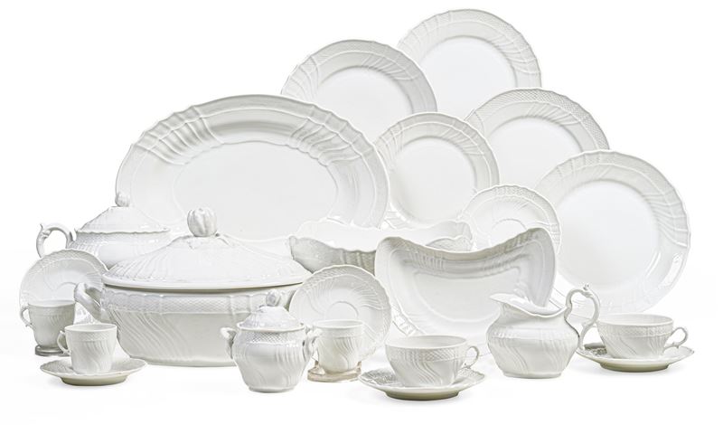Il servizio conta 92 pezzi ed è così composto: 12 piatti fondi (diametro cm 23,5); 24 piatti piani (diametro cm 24,5); 10 piatti da antipasto (diametro cm 19,3); 3 piatti da dessert (diametro cm 21,5); 12 piattini per insalata a forma di mezzaluna (cm 23x13,5); 1 zuppiera (altezza cm 21,5; cm 34x19,5); 1 insalatiera (altezza cm 12,5; diametro cm 25); 2 piatti da portata tondi (diametro cm 32,5); 2 piatti da portata ovali (cm 38,5x28); 10 tazze da caffè con 11 piattini (altezza tazza cm 6; diametro piattino cm 13); 12 tazze da tè con piattino (altezza tazza cm 6,5; diametro piattino cm 15); 1 teiera (altezza cm 16,5); 1 lattiera (altezza cm 11,5); 1 zuccheriera (altezza cm 12)
