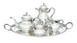 composto da vassoio, teiera, caffettiera, zuccheriera e lattiera. Profili con motivo a cordone "San Marco"