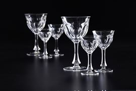 Il servizio per 6 persone conta 18 pezzi ed è così composto: 6 calici da acqua (altezza cm 19,5); 6 calici da vino (altezza cm 14,5); 6 calci da rosolio (altezza cm 13)